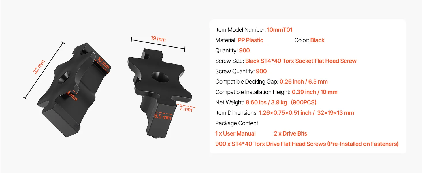 VEVOR 900x verborgen bevestigingen, afstandhouders voor vlonderplanken, universele composiet T-clips en kunststof bevestigingen met schroeven, geschikt voor plankafstanden van 6,5 mm en plankhoogte van 10 mm