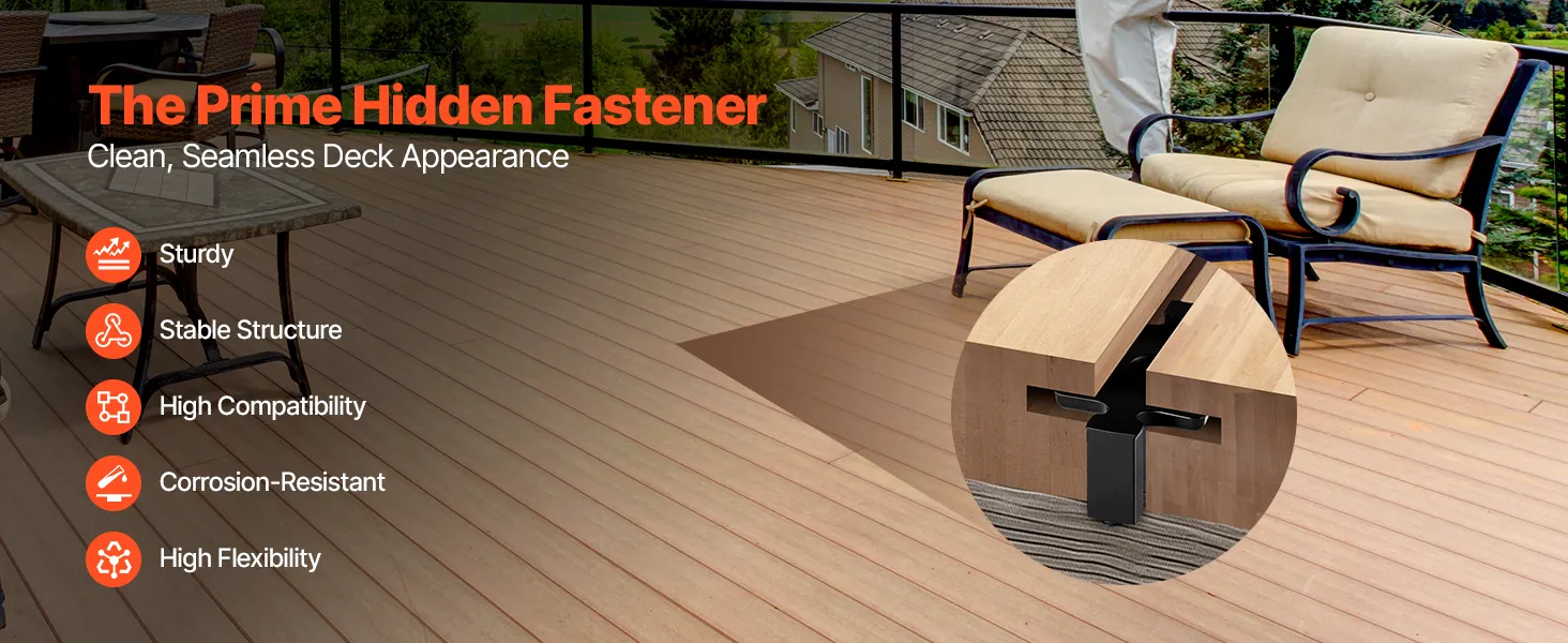 Robuuste, verborgen bevestigingsmiddelen voor terrassen: Deze verborgen bevestigingsmiddelen voor terrassen zijn gemaakt van polypropyleen en roestvrij staal 304 en bieden duurzame sterkte en corrosiebestendigheid, ideaal voor gebruik buitenshuis.