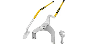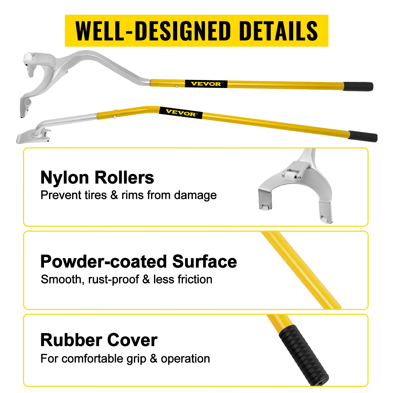 De rubberen coating zorgt voor een comfortabele grip en de gepoedercoate afwerking vermindert wrijving. Zowel de demontage- als montagestangen zijn voorzien van nylon rollen die de kans op beschadiging van de band tijdens het werk verkleinen.