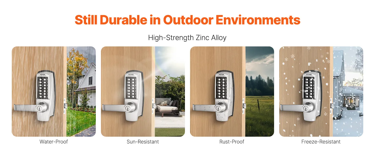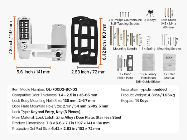 Universele compatibiliteit voor verschillende deuren: Dit mechanische sleutelloze deurslot wordt geleverd met verschillende schroeven en vierkante assen, waardoor het geschikt is voor deuren met een dikte van 35-65 mm (1,4 tot 2,5 inch). Het is compatibel met een breed scala aan deuren, waaronder poorten, tuindeuren, garages, opslagruimtes, smeedijzeren, aluminium en hekdeuren