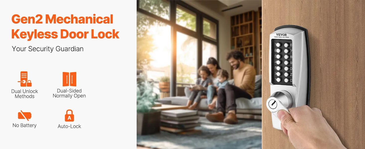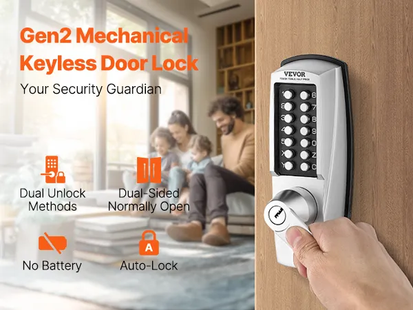 Mechanisch combinatieslot van de 2e generatie: Dit mechanische sleutelloze deurslot heeft een volledig mechanisch ontwerp, waardoor het sabotagebestendig is en niet hoeft te worden opgeladen of batterijen nodig heeft. Dankzij de eenvoudige installatie en bediening biedt het een hoge mate van veiligheid. De tweede generatie maakt het wijzigen van wachtwoorden eenvoudiger en de verstelbare linker-/rechterhandgrepen bieden meer flexibiliteit