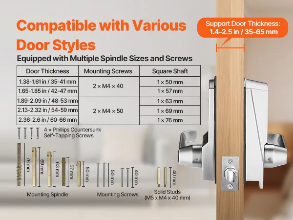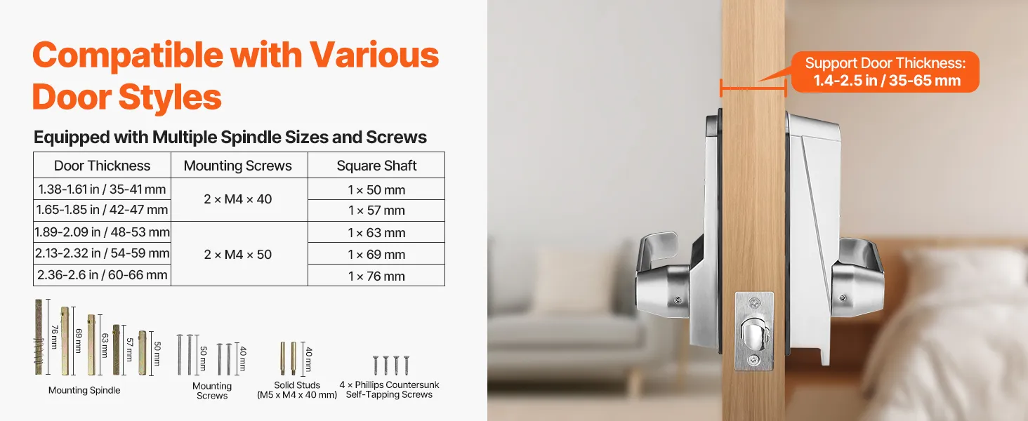 Het mechanische sleutelloze deurslot is compatibel met deuren met een dikte van 35 tot 65 mm. Het wordt geleverd met verschillende sets bevestigingsspindels en schroeven, zodat u de juiste installatieaccessoires kunt kiezen, afhankelijk van uw deurtype, voor meer flexibiliteit en gemak.