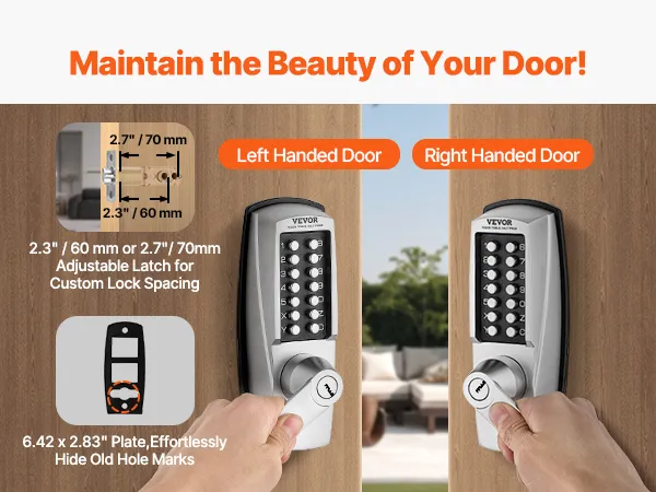 Eenvoudiger deurslot vervangen: Dit mechanische deurslot is voorzien van een verstelbare knop, waardoor het geschikt is voor zowel linker- als rechterdeuren. Verstelbare montagegatafstand (2,3" / 60 mm en 2,7" / 70 mm) en bredere grondplaten maken grote gaten overbodig, waardoor het uiterlijk van uw deur behouden blijft en tegelijkertijd maximale veiligheid wordt geboden