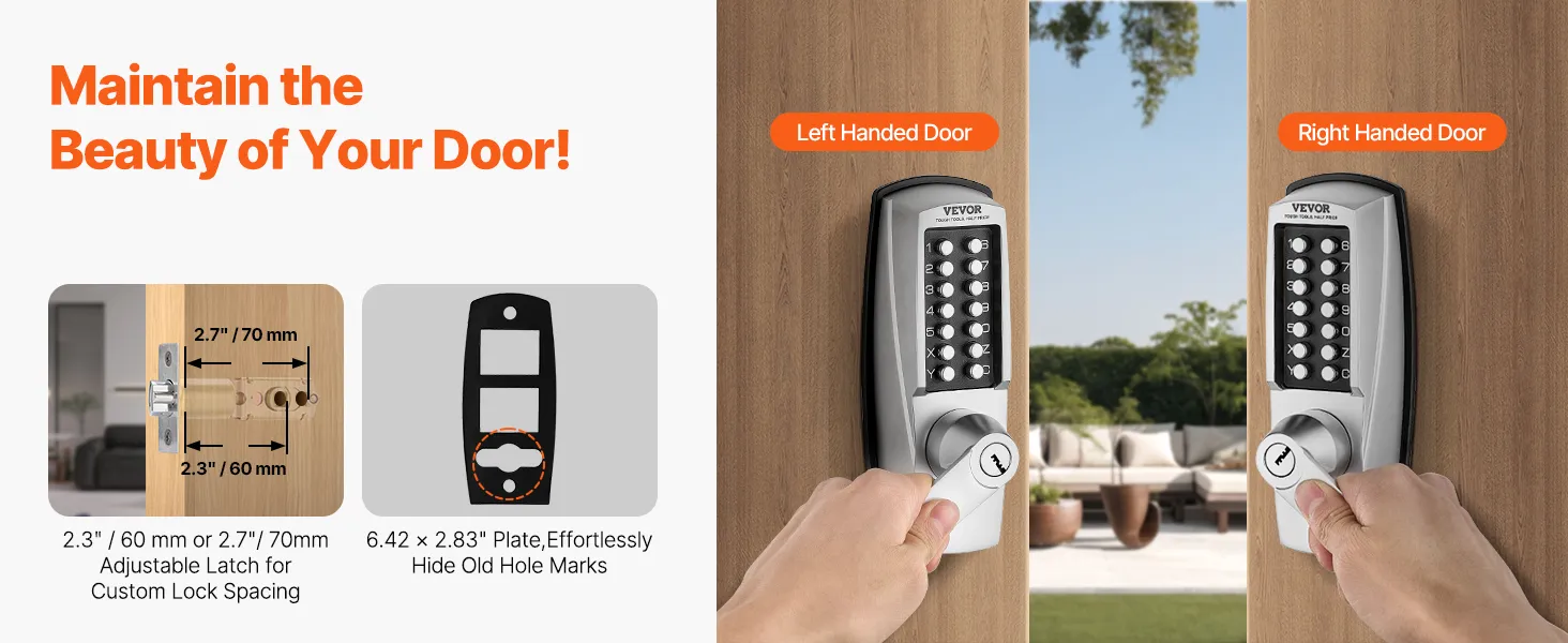 Met dit mechanische combinatieslot zonder sleutel, verstelbare handgrepen, beweegbare grendels en vergrote montageplaten kunt u uw oude deurbeslag vervangen zonder dat u extra hoeft te zagen of te boren.