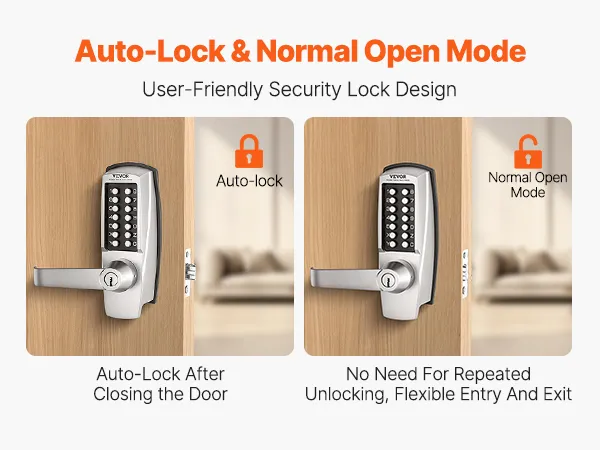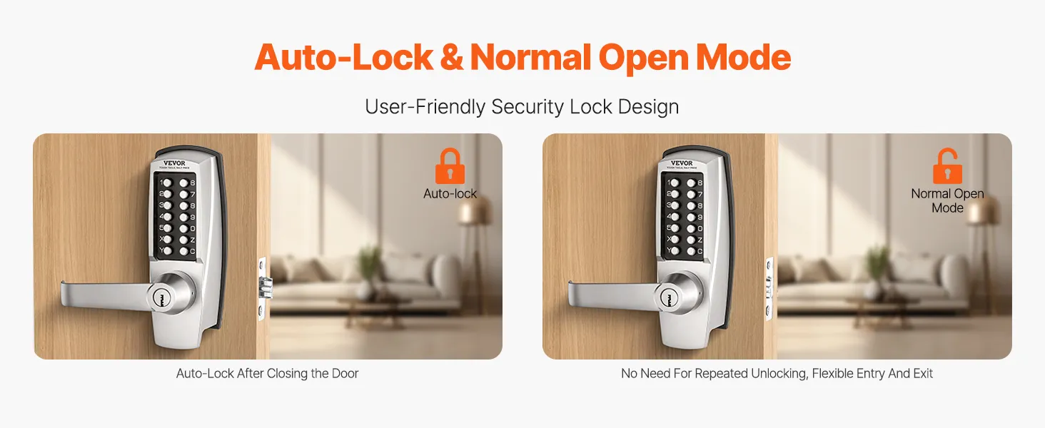 Automatisch vergrendelen en openhouden: Het mechanische deurslot wordt automatisch vergrendeld wanneer de deur wordt gesloten, zodat u nooit hoeft te vergeten de deur op slot te doen. De openhoudmodus is ideaal voor gebieden met frequente toegang en maakt een gemakkelijke in- en uitgang mogelijk