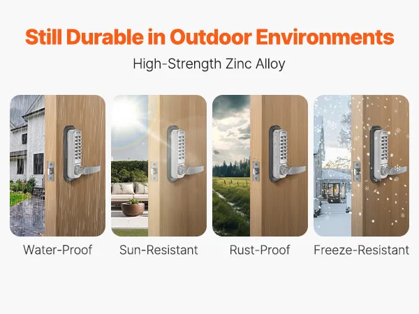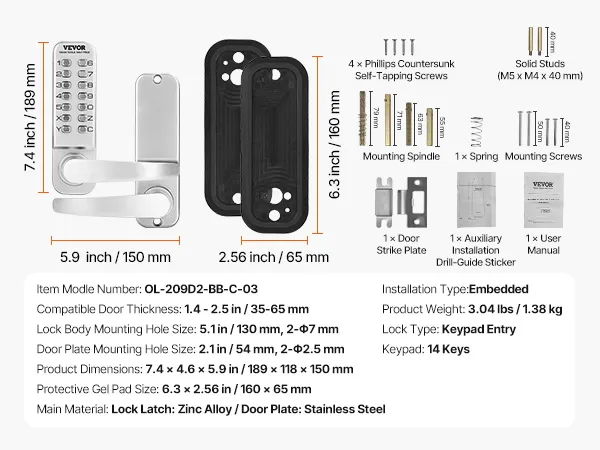 Universele compatibiliteit voor verschillende deuren: Dit mechanische sleutelloze deurslot is verkrijgbaar met verschillende schroefmaten en vierkante assen, waardoor het compatibel is met deuren van 35-65 mm (1,4 tot 2,5 inch) dik. Het is geschikt voor verschillende soorten deuren, waaronder tuindeuren, buitendeuren voor in de tuin, garages, opslagruimtes, smeedijzeren deuren, aluminium deuren en hekdeuren.