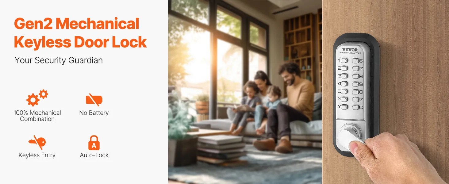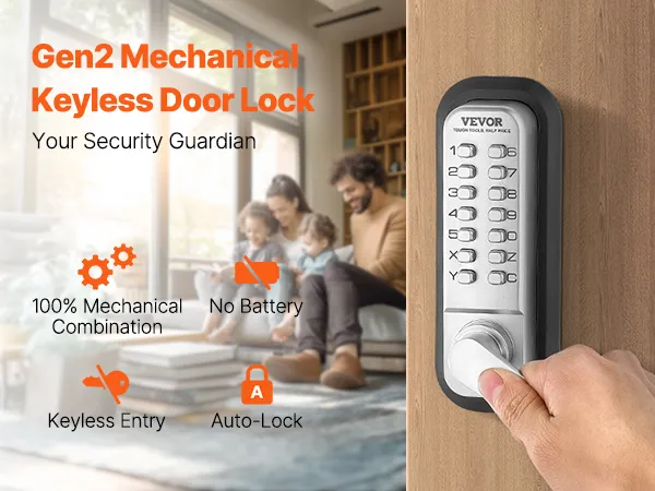 Mechanisch combinatieslot van de 2e generatie: Dit sleutelloze mechanische deurslot heeft een volledig mechanisch ontwerp, waardoor het sabotagebestendig is en niet hoeft te worden opgeladen of batterijen nodig heeft. De eenvoudige installatie en bediening garanderen een hoge mate van veiligheid, terwijl het ontwerp van de tweede generatie het eenvoudig maakt om wachtwoorden te wijzigen. De verstelbare linker-/rechterhandgrepen zorgen voor extra flexibiliteit