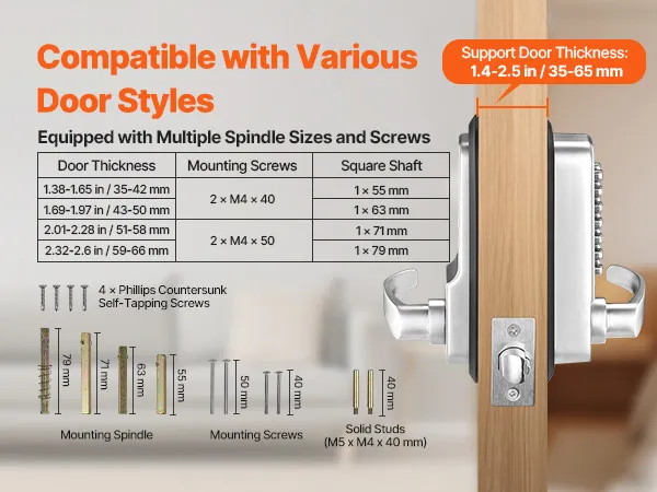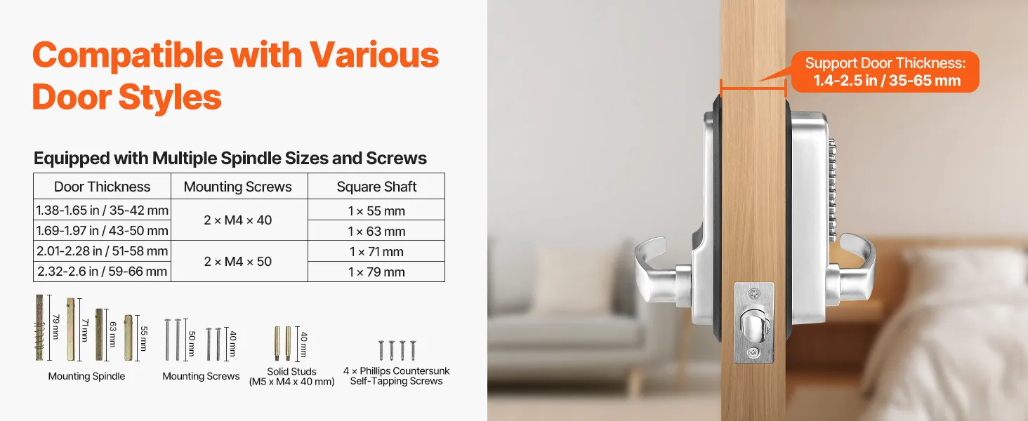 Het mechanische sleutelloze deurslot is compatibel met deuren met een dikte van 35 tot 65 mm. Het wordt geleverd met verschillende sets bevestigingsspindels en schroeven, zodat u de juiste installatieaccessoires kunt kiezen, afhankelijk van uw deurtype, voor meer flexibiliteit en gemak.