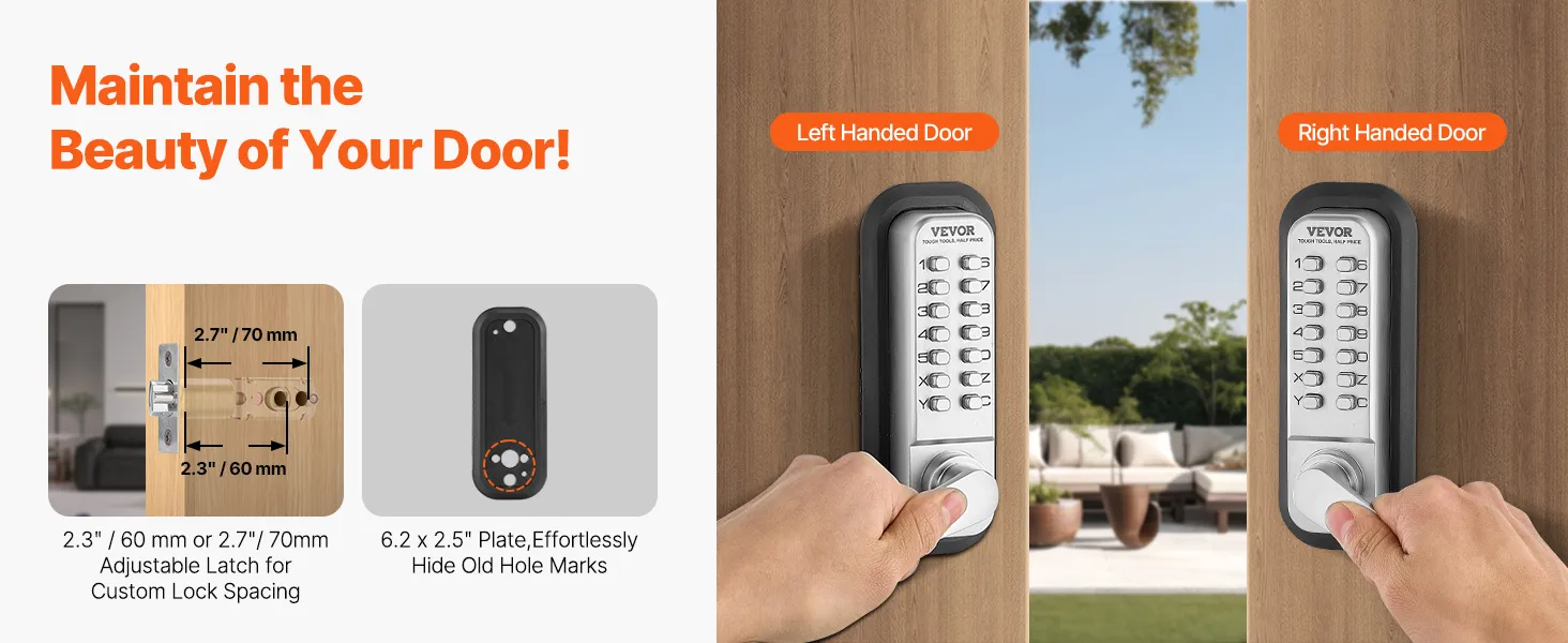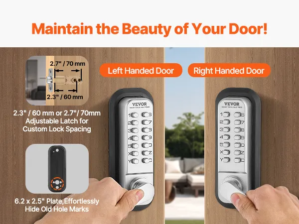 Eenvoudig deurslot vervangen: Dit mechanische deurslot is voorzien van een verstelbare duimknop, waardoor het geschikt is voor zowel linker- als rechterdeuren. Verstelbare montagegatafstand (2,3" / 60 mm en 2,7" / 70 mm) en bredere grondplaten maken grote gaten overbodig, waardoor het uiterlijk van uw deur behouden blijft en de beveiliging wordt verbeterd