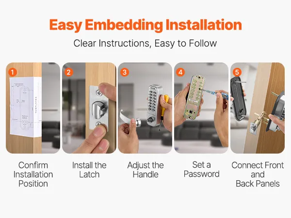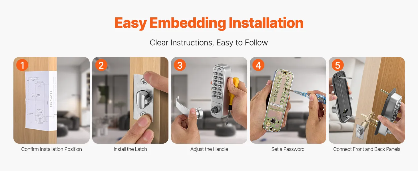 Het deurslot wordt geleverd met een boormal. U hoeft alleen de positie te bevestigen en uw gereedschap te gebruiken om het slot te installeren zonder de deur te beschadigen. Dankzij de duidelijke instructies is het wijzigen van het wachtwoord met een schroevendraaier een fluitje van een cent.