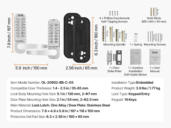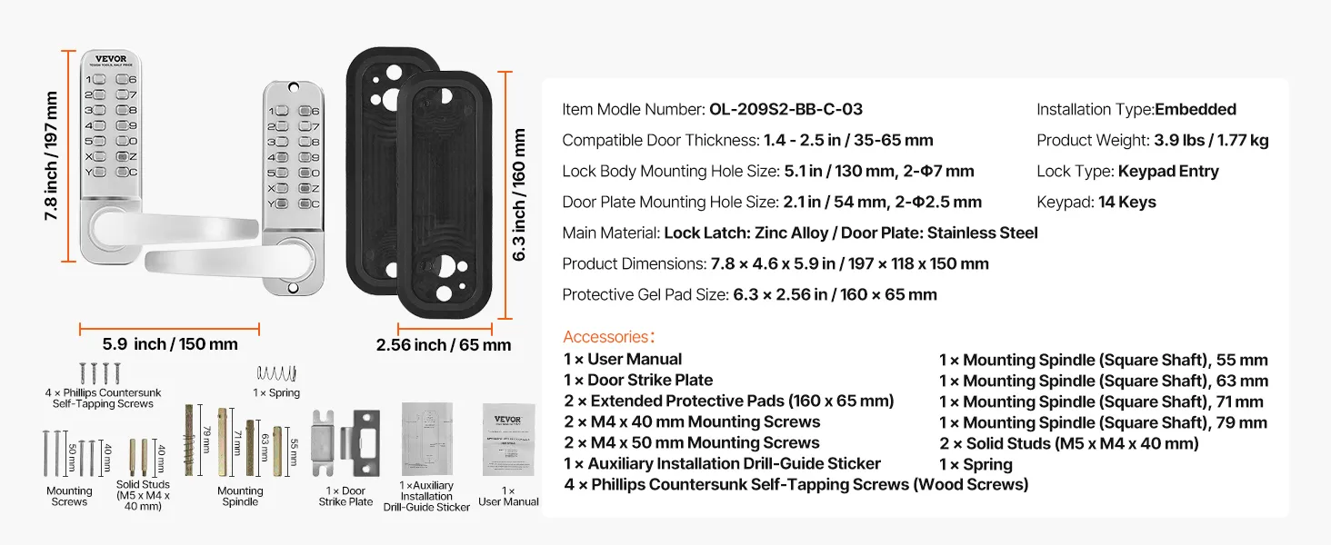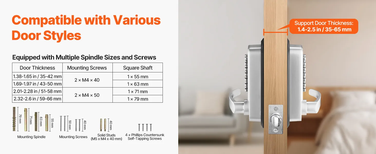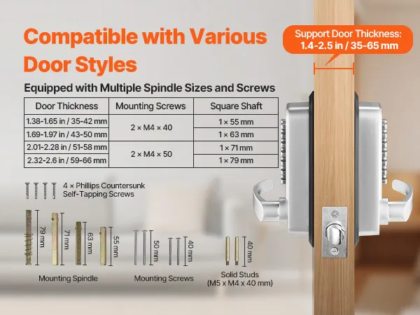 This mechanical keyless door lock is compatible with doors ranging from 1.4 to 2.5 in (35-65 mm) in thickness. It comes with multiple sets of mounting spindles and screws, allowing you to choose the appropriate installation accessories based on your door type for better flexibility and convenience.