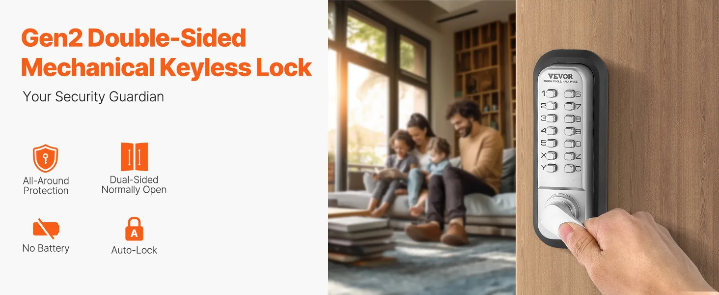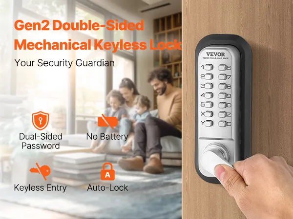 The second-generation mechanical keyless entry door lock requires no wiring or keys, automatically locking when the door closes for great anti-theft protection. The double-sided lock stops outsiders from reaching in, ideal for courtyards. Changing the password is easy with a screwdriver.