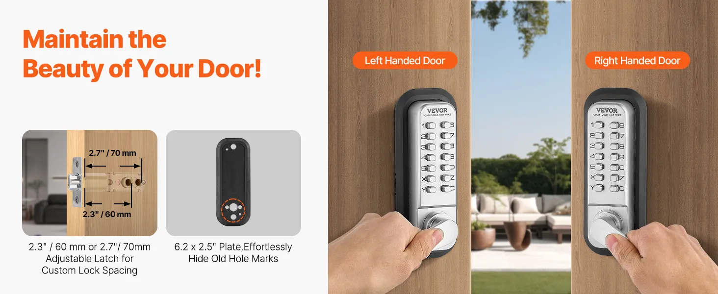 Easy Door Lock Replacement: With adjustable left/right handles, this mechanical door lock fits both left and right doors. The adjustable hole distance (2.3 in /60 mm and 2.7 in / 70 mm) and wider, reinforced pads mean you don't need large holes to install it, helping maintain the aesthetic of your door while ensuring safety
