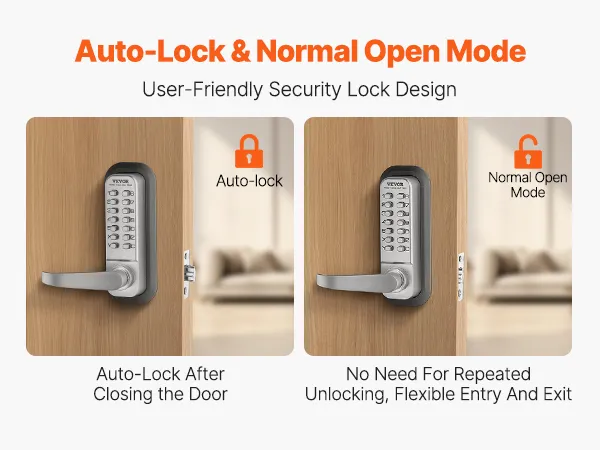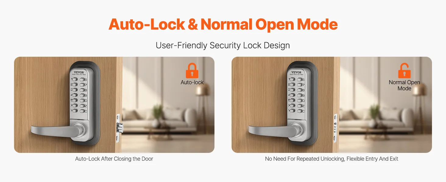 Automatic Locking & Hold Open Mode: This keyless mechanical combination door lock automatically engages when the door is closed, so you don't need to worry about forgetting to lock it. The hold-open mode is ideal for areas with frequent access, delivering added convenience