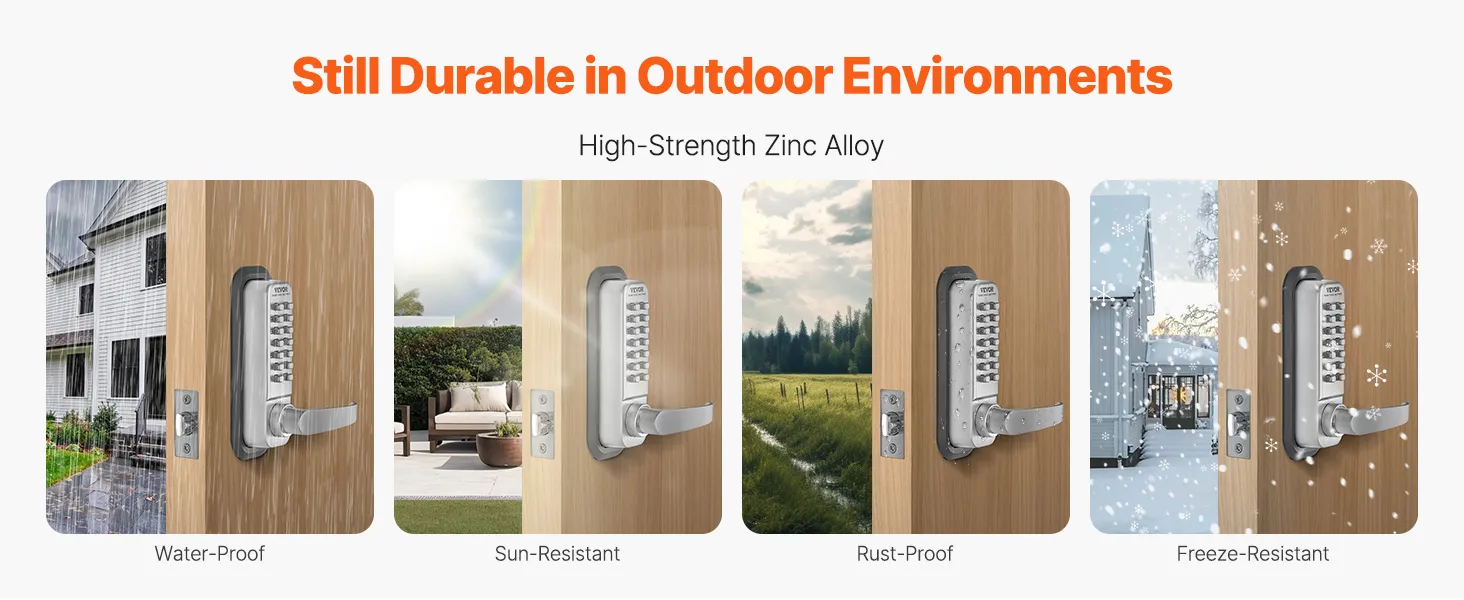 Durable Zinc Alloy Material: The latch bolt is made from zinc alloy; this keyless mechanical combination door lock has a corrosion-resistant electroplated coating, ensuring water and rust resistance. It keeps your home secure in all weather conditions, from cold winters to hot summers and rainy days, with a longer work service