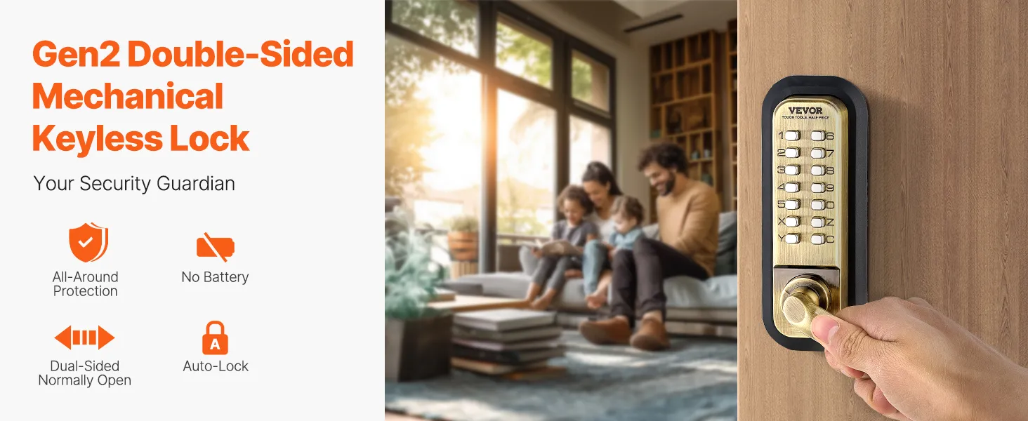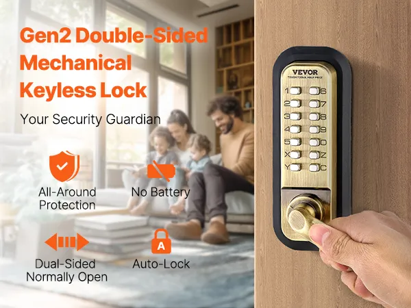 The second-generation mechanical keyless entry door lock requires no wiring or keys, automatically locking when the door closes for great anti-theft protection. The double-sided lock stops outsiders from reaching in, ideal for courtyards. Changing the password is easy with a screwdriver.