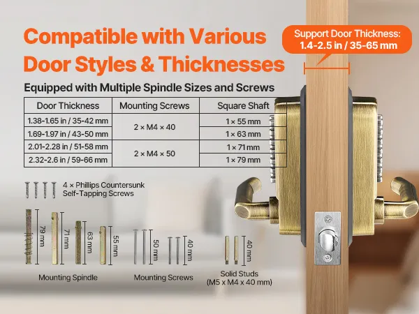 This mechanical keyless door lock is compatible with doors ranging from 1.4 to 2.5 in (35-65 mm) in thickness. It comes with multiple sets of mounting spindles and screws, allowing you to choose the appropriate installation accessories based on your door type for better flexibility and convenience.