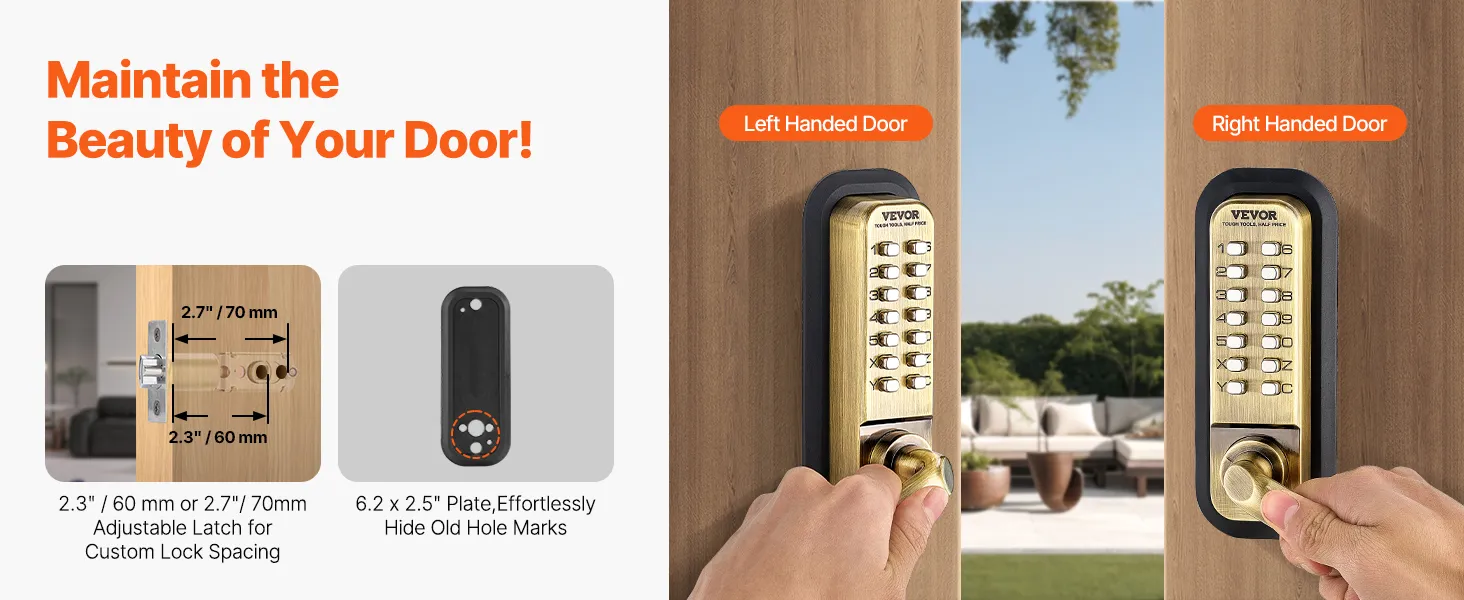 Easy Door Lock Replacement: With adjustable left/right handles, this mechanical door lock works for both left and right doors. The adjustable hole spacing (2.3 in/60 mm and 2.7 in/70 mm) and reinforced wider pads avoid the need for large holes, keeping your door's aesthetic intact while providing superior security