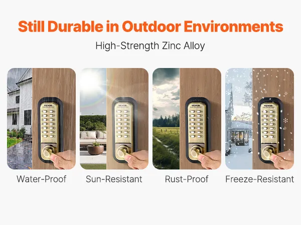 Durable Zinc Alloy Material: The latch bolt is made from zinc alloy; this keyless mechanical combination door lock features a corrosion-resistant electroplated coating for enhanced water and rust resistance. It stands up to all weather conditions—cold winters, hot summers, and rainy days—ensuring your home stays secure with a long-lasting performance