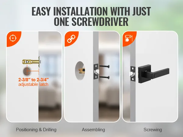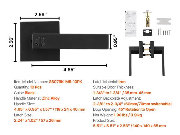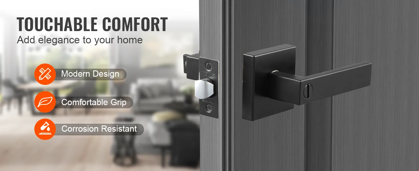 Our black door lever is designed with a locking function to protect your privacy from the inside. It comes with a 2-3/8 inches or 2-3/4 inches adjustable latch, suitable for doors with thickness ranging from 1-3/8 inches to 1-3/4 inches. Compatible with over 95% of interior doors.