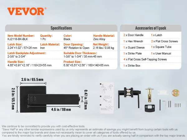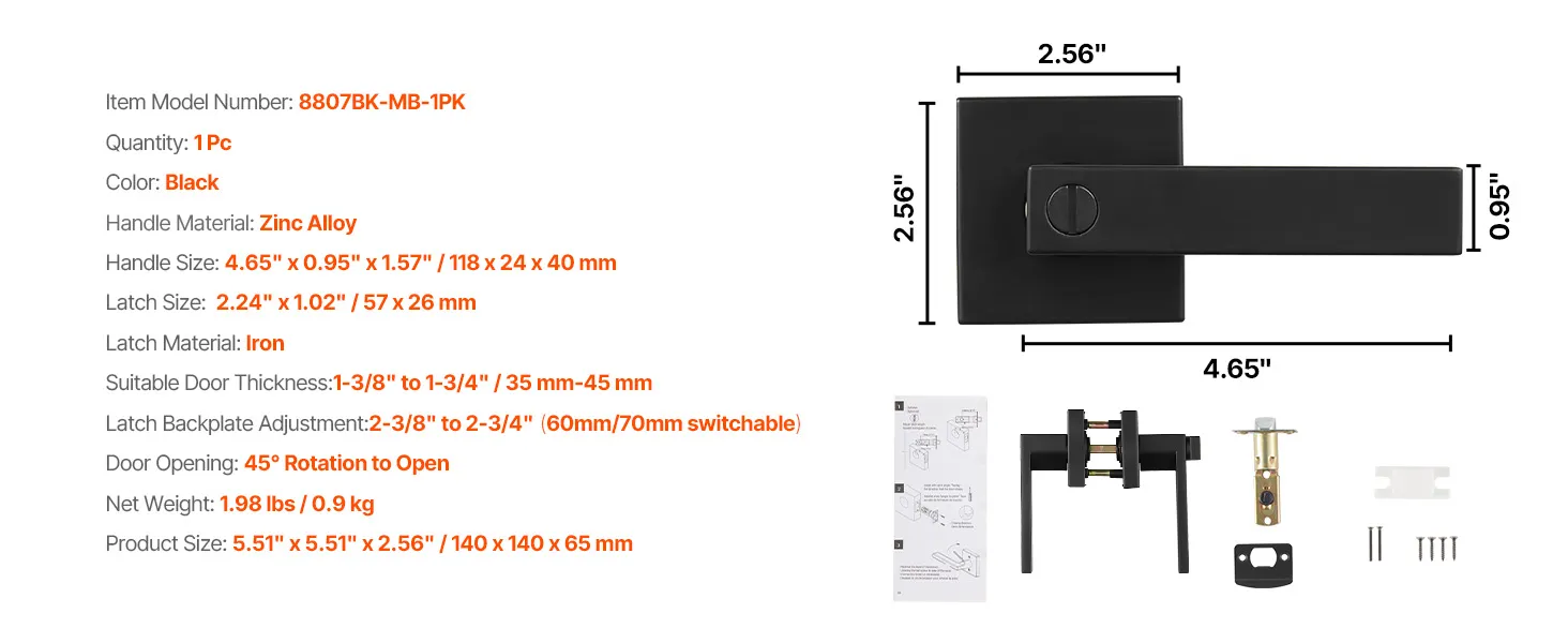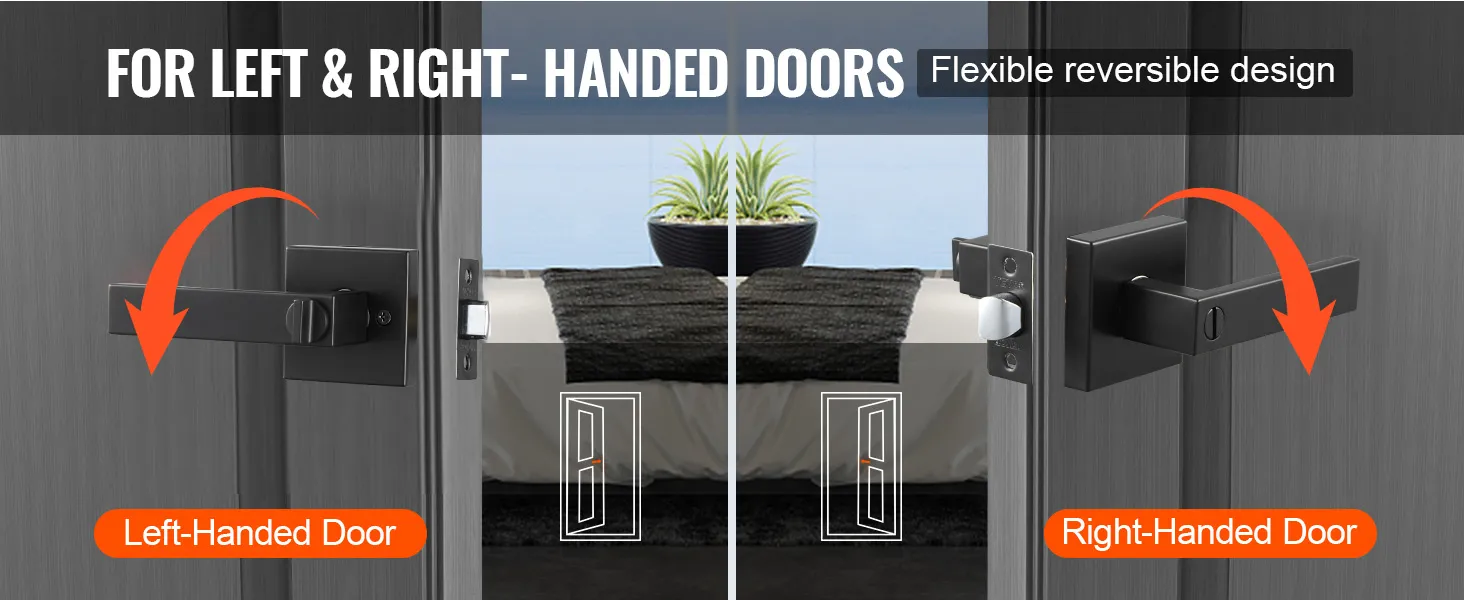 Universal & Reversible Design: Our black door lever comes with an adjustable latch of 2-3/8 inches(60mm) or 2-3/4 inches(70mm), suitable for doors with thickness ranging from 1-3/8 inches(35mm) to 1-3/4 inches (45mm). The reversible design allows installation on both left and right-handed doors, making it suitable for over 95% of interior doors