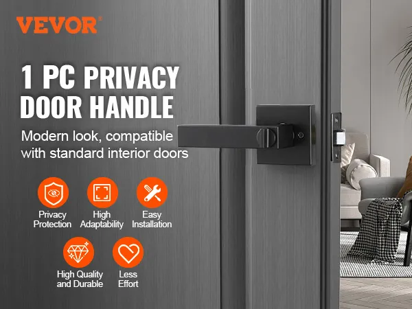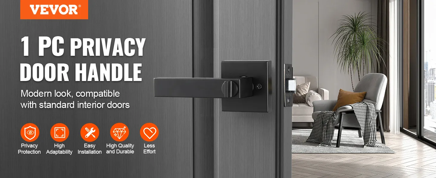 VEVOR Privacy Door Handle, 1 Pack Matte Black Door Lever, Left or Right Handing Reversible Lever with Keyless Lock, 45° Rotation to Open, Universal Square Interior for Bedroom and Bathroom Doors