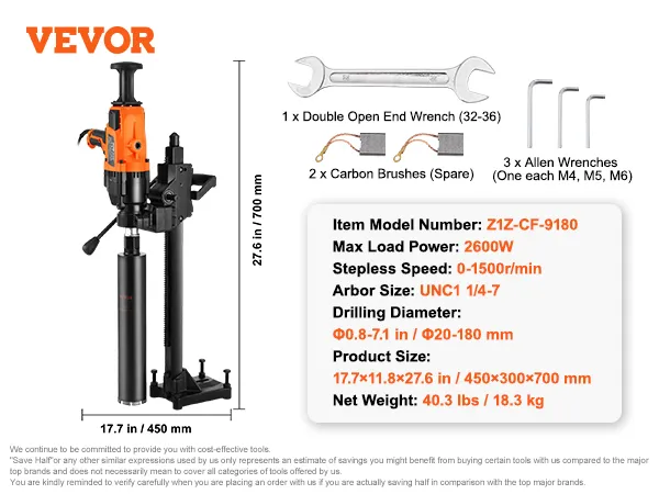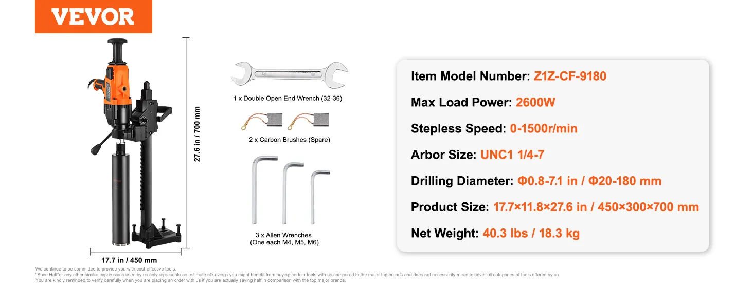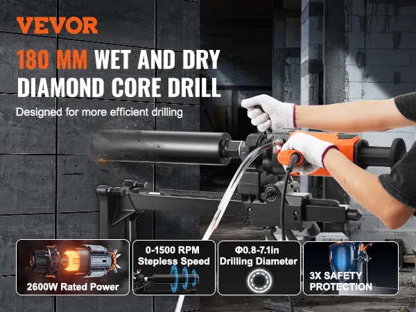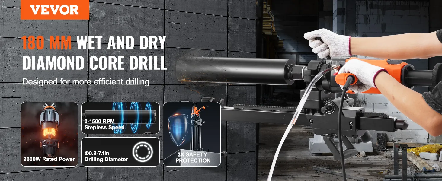 Powerful Core Drilling Efficiency: Equipped with a 2600W motor and adjustable speed, this core drill rig can handle hole sizes from Φ0.8-7.1 in / Φ20-180 mm with ease. Whether drilling large or small holes, this tool ensures every task is efficient and precise.