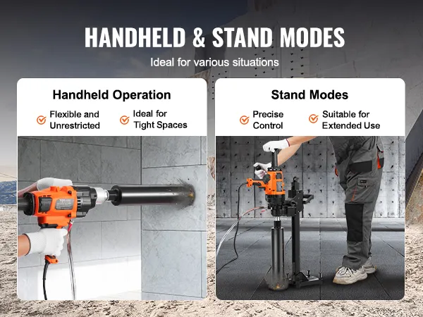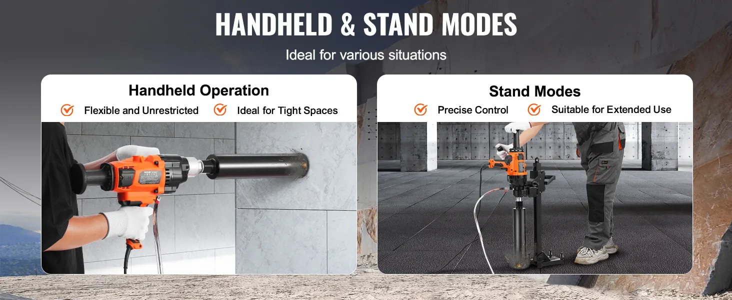 Our core drill rig features handheld and stand-mount modes to suit your task. The handheld mode is ideal for flexible operation and precise control, while the stand-mount mode provides added stability, making it perfect for large-scale or extended projects and reducing operator fatigue.