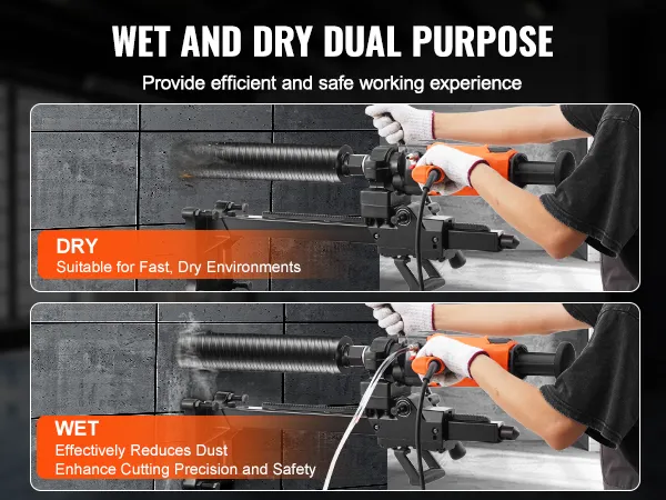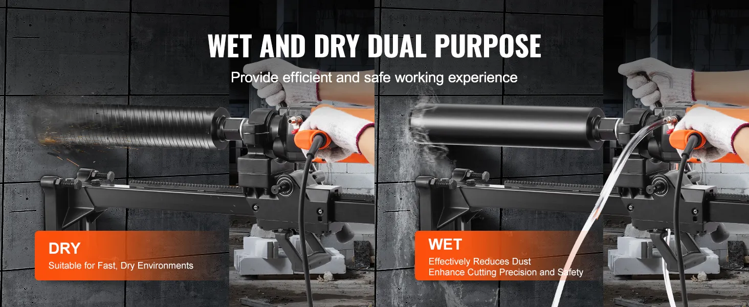 Wet & Dry Cutting Capabilities: Our concrete core drill supports both dry and wet cutting modes. Dry cutting is ideal for fast drilling in dry environments or high-efficiency scenarios, while wet cutting reduces dust and heat, providing enhanced safety and comfort during operation.
