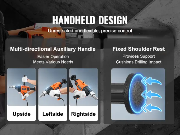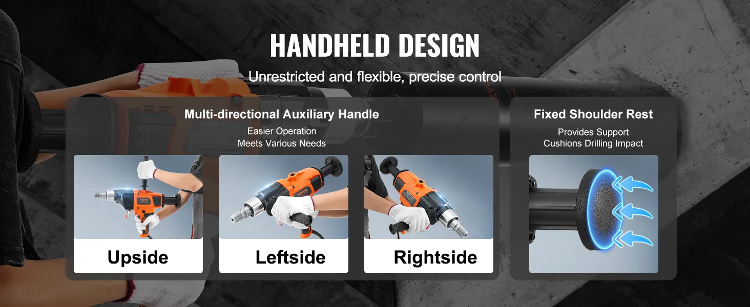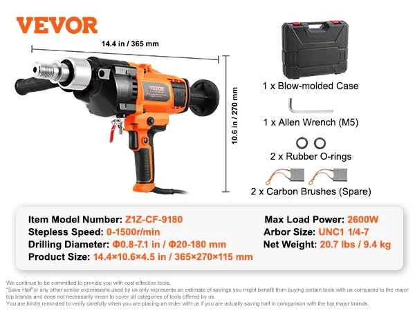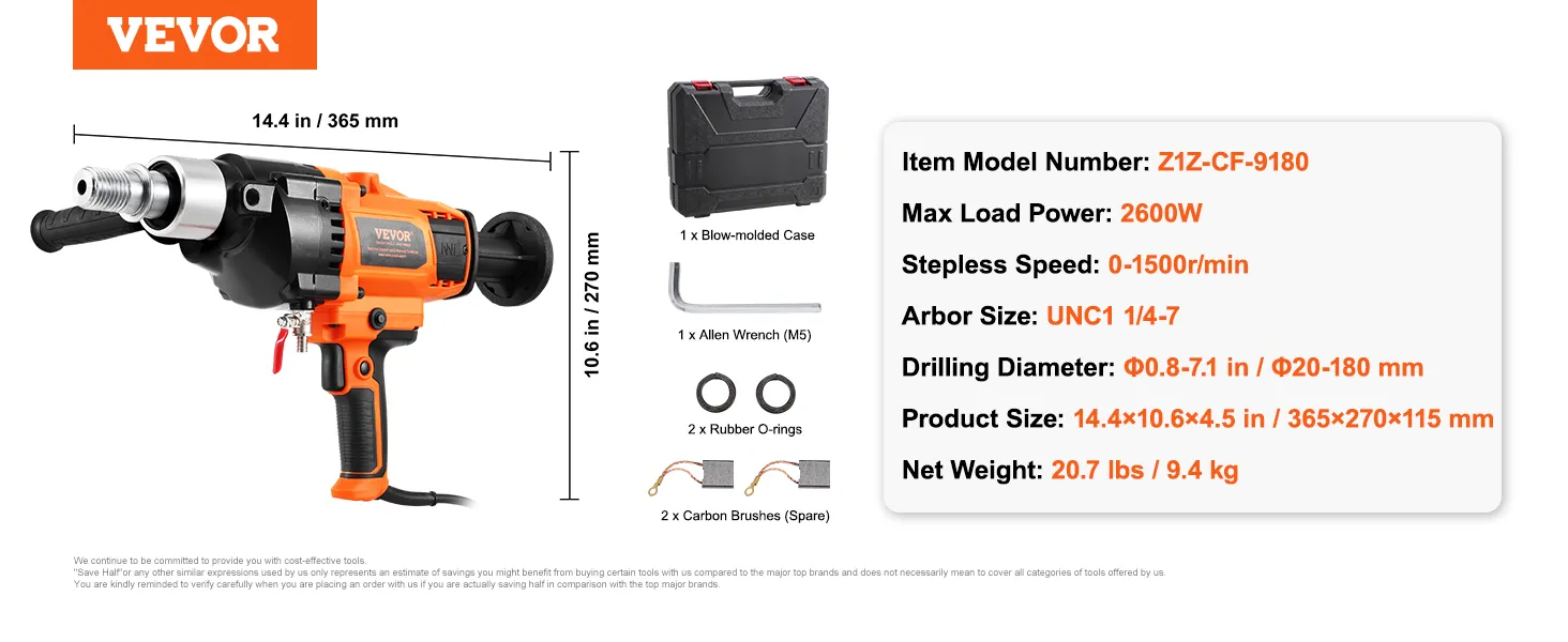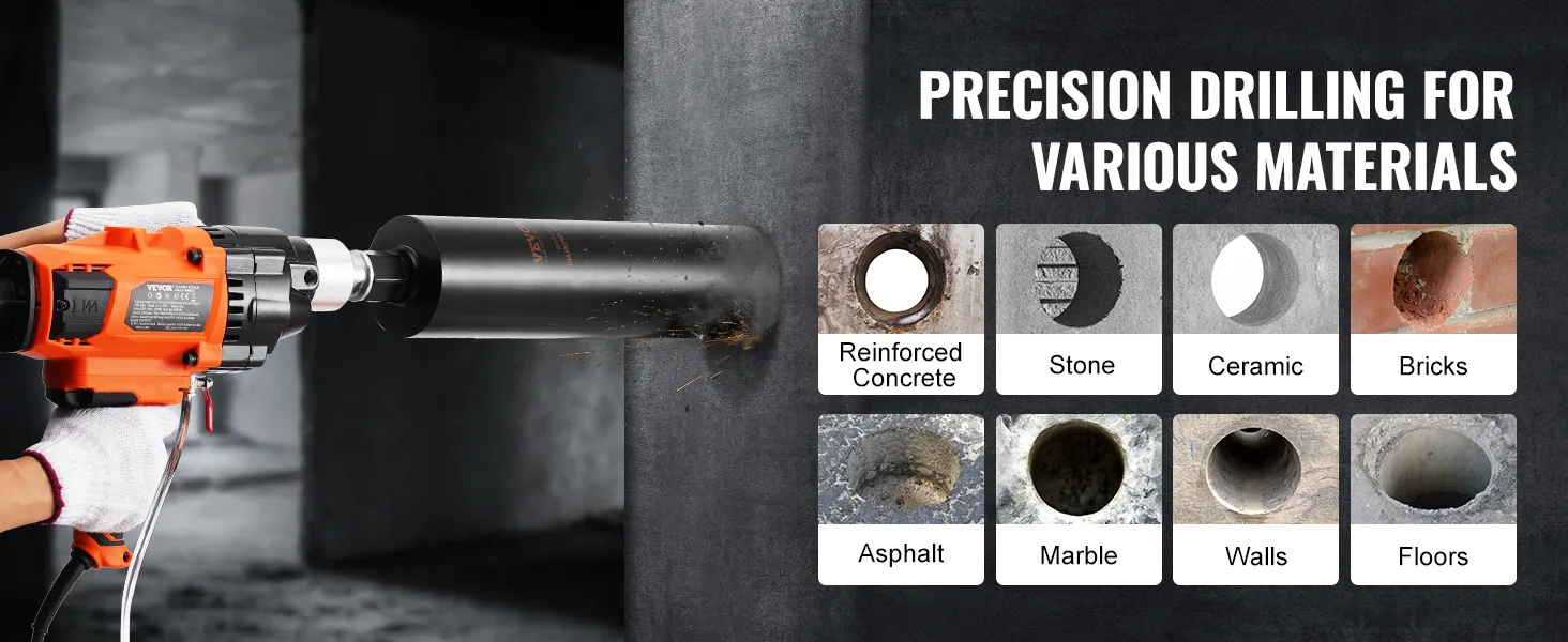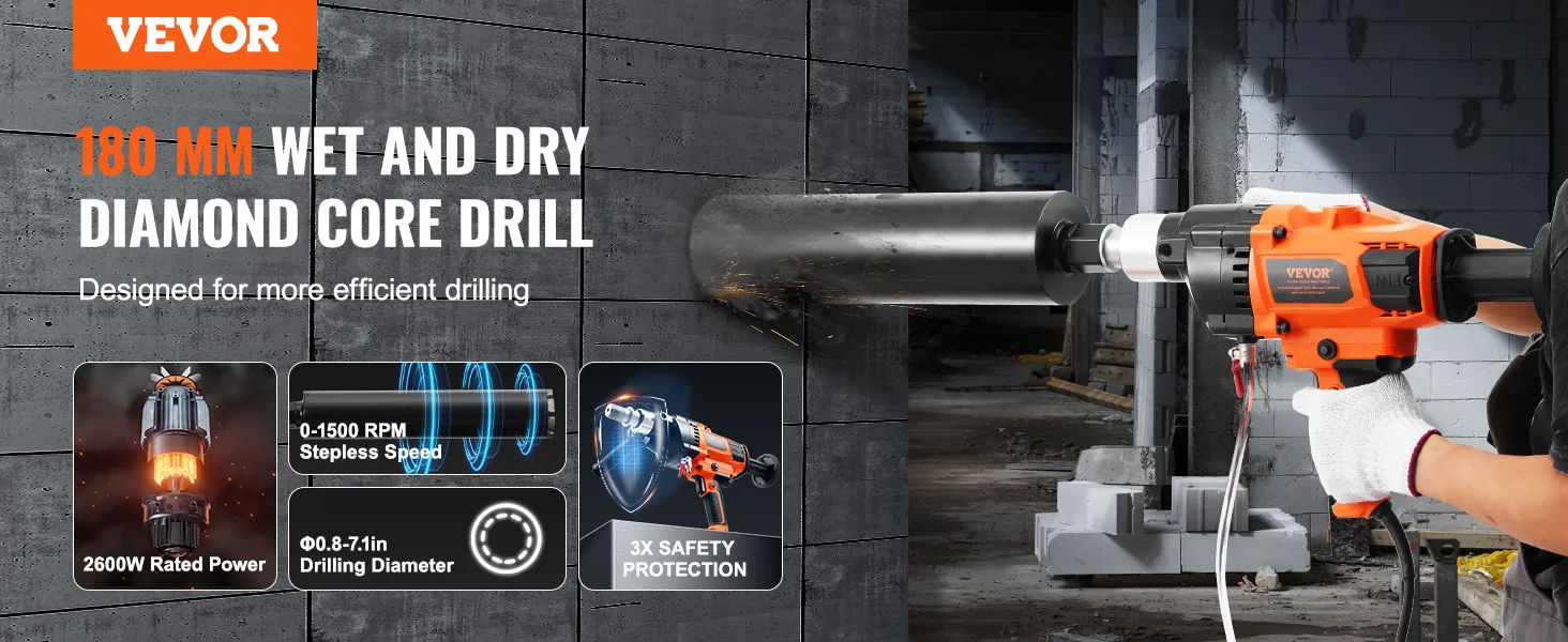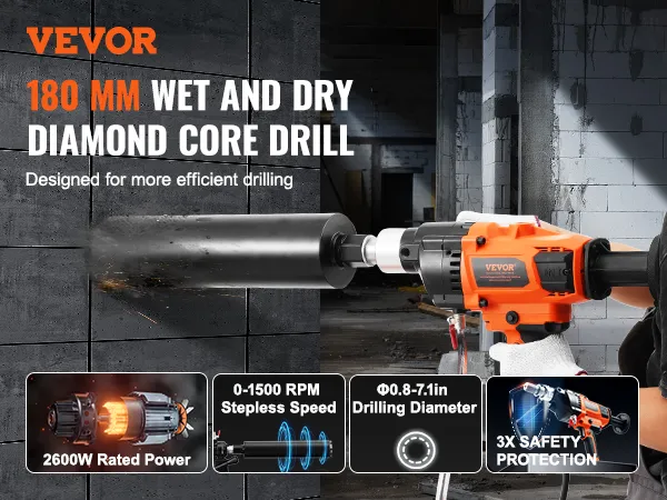 Krachtig kernboren: Uitgerust met een motor van 2600 W en instelbare snelheid, kan deze kernboormachine gemakkelijk gaten van Φ0,8-7,1 inch / Φ20-180 mm boren. Of er nu grote of kleine gaten moeten worden geboord, dit gereedschap voert elke taak efficiënt en nauwkeurig uit.