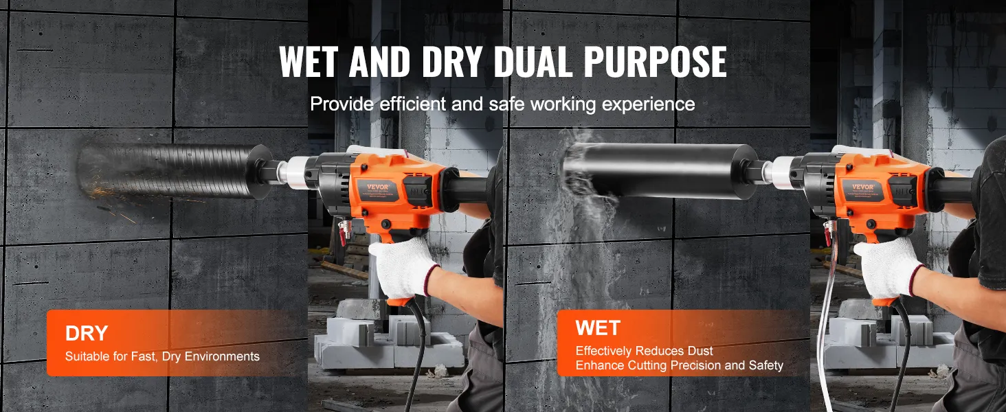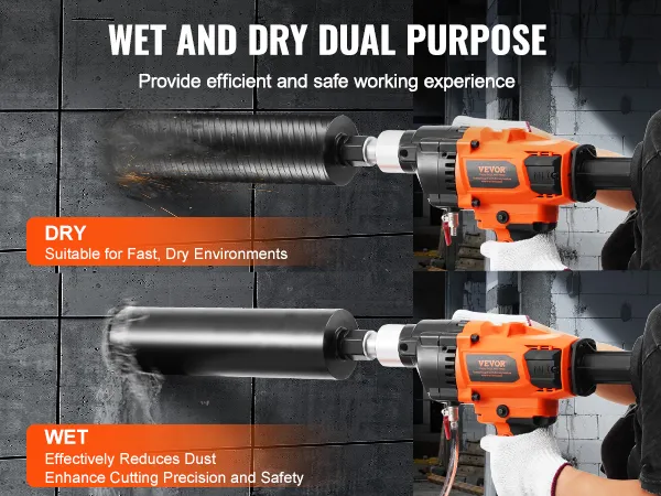 Nat en droog zagen: onze betonkernboor ondersteunt zowel droog als nat zagen. De droge snijmodus is ideaal voor snel boren in droge omgevingen of waar hoge vermogensvereisten vereist zijn, terwijl de natte snijmodus de vorming van stof en warmte vermindert voor meer veiligheid en comfort tijdens het werken.