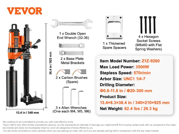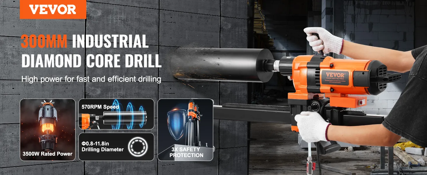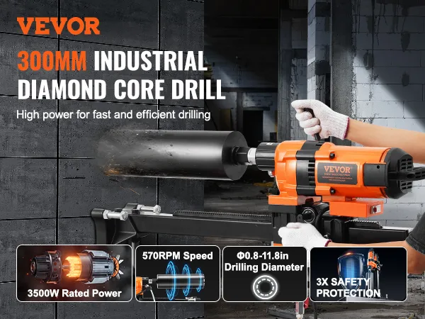 Powerful Core Drilling Efficiency: Equipped with a 3500W motor, this core drill machine handles hole sizes from Φ0.8-11.8 in / Φ20-300 mm effortlessly. Whether you're drilling large or small holes, it ensures efficient and precise results every time.