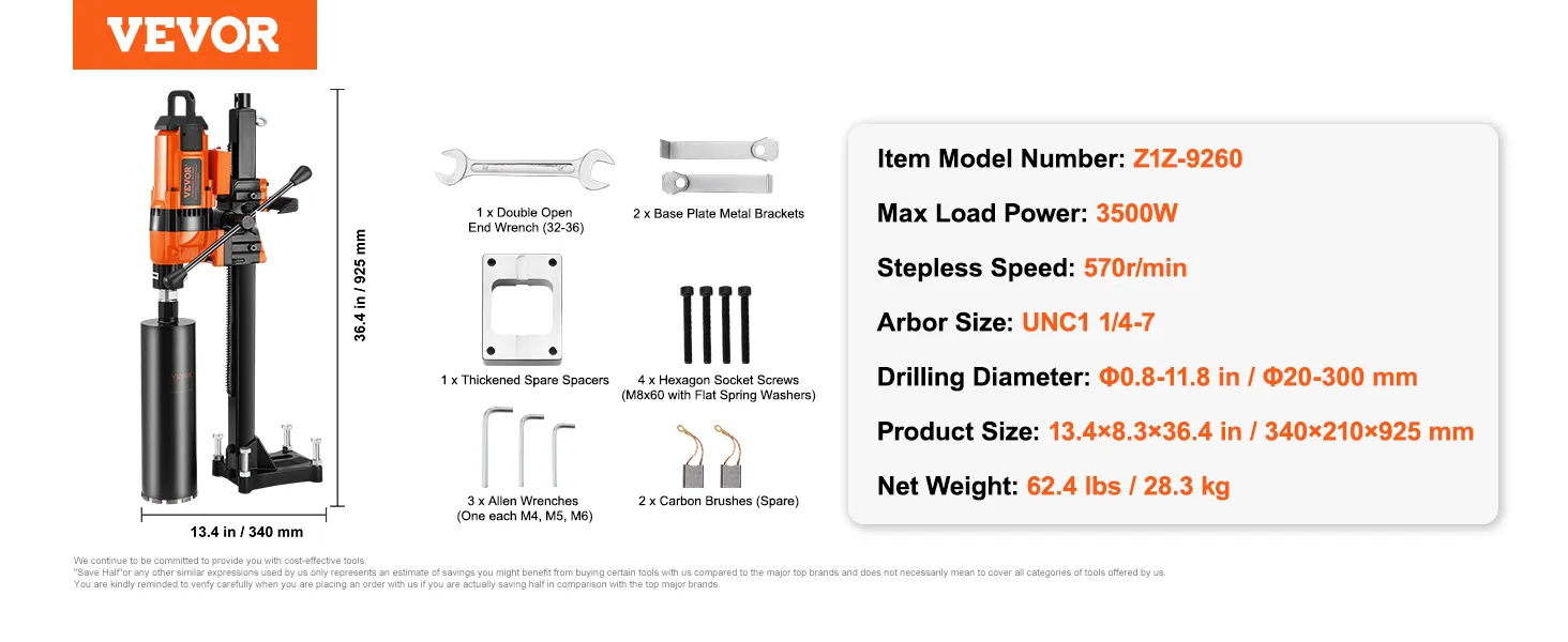 Professional Accessories Included: The core drilling machine comes with a Φ5 in / Φ127 mm drill bit, allowing quick completion of large-diameter drilling tasks. It includes two carbon brushes and a double-ended wrench for convenient and quick maintenance.