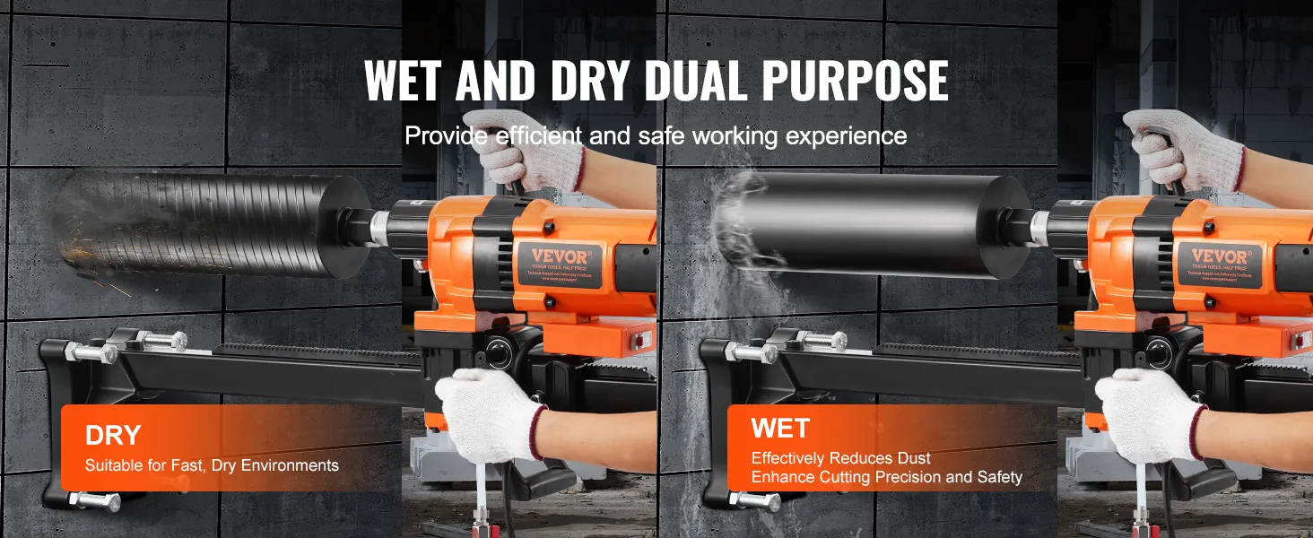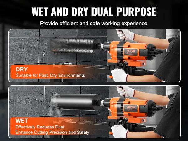 Experience superior cutting and debris removal speed with the dry cutting mode. The wet cutting mode reduces dust and overheating during operation, improving safety and comfort in the work environment. It also helps reduce tool wear, extending the core drilling machine's lifespan.