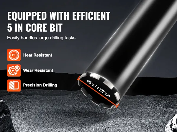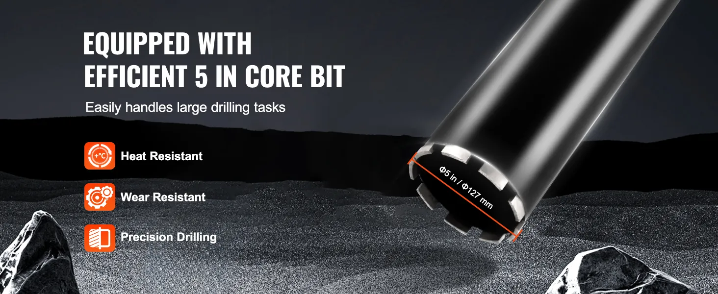 Equipped with a Φ5in/Φ127mm large-diameter drill bit, this concrete core drill excels in large-scale projects or specialized applications. Whether it's construction, renovation, or DIY tasks, this drill ensures every hole is precise and accurate.