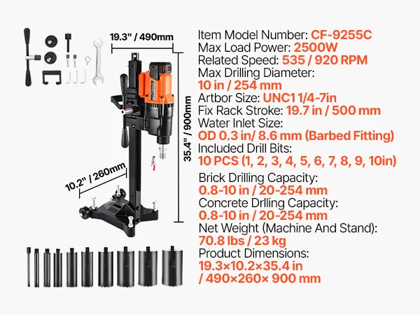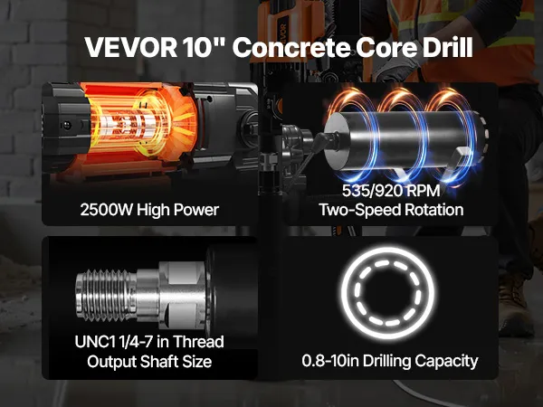 VEVOR diamantkernboormachine, maximale boordiameter 26 cm, nat/droog diamantboren met 10 boren en boorstandaard, instelbare snelheid, UNC1 1/4-7 schroefdraad, voor beton en baksteen, 2500 W