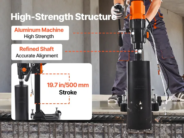 Duurzaam: Dankzij de lichtgewicht maar robuuste aluminium behuizing is deze kernboormachine slijtvast. De wielen vergemakkelijken het transport. De PVC-waterslang is scheurvast en de stalen as zorgt voor constante nauwkeurigheid.