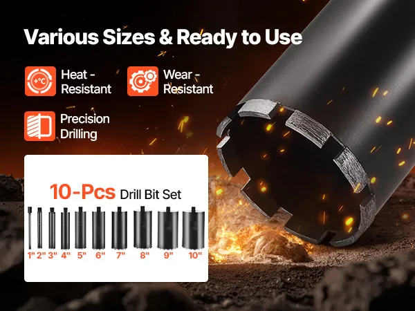 Professionele set: Deze betonkernboor set bevat tien hoogwaardige boren (1", 2", 3", 4", 5", 6", 7", 8", 9", 10") waarmee u door gewapend beton, baksteen, marmer en meer kunt boren. Ideaal voor al uw boorklussen.