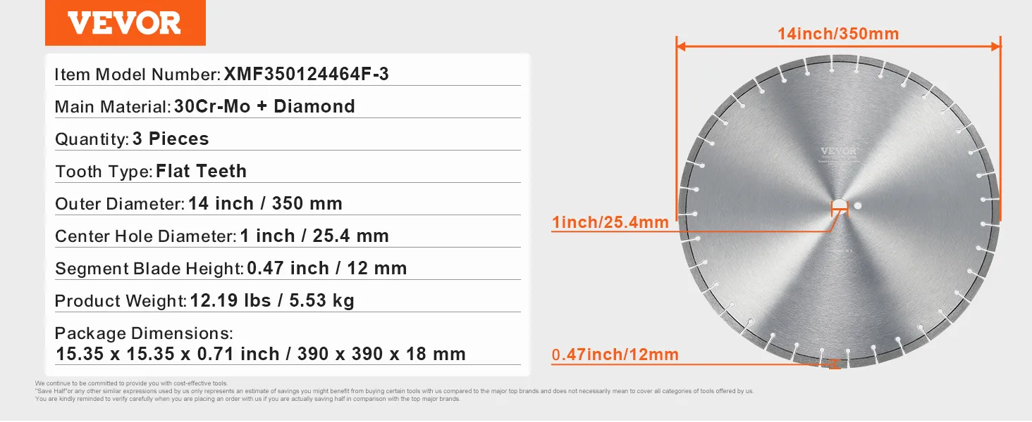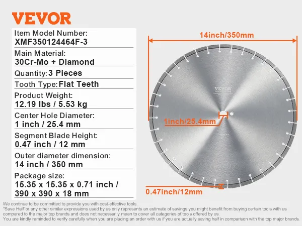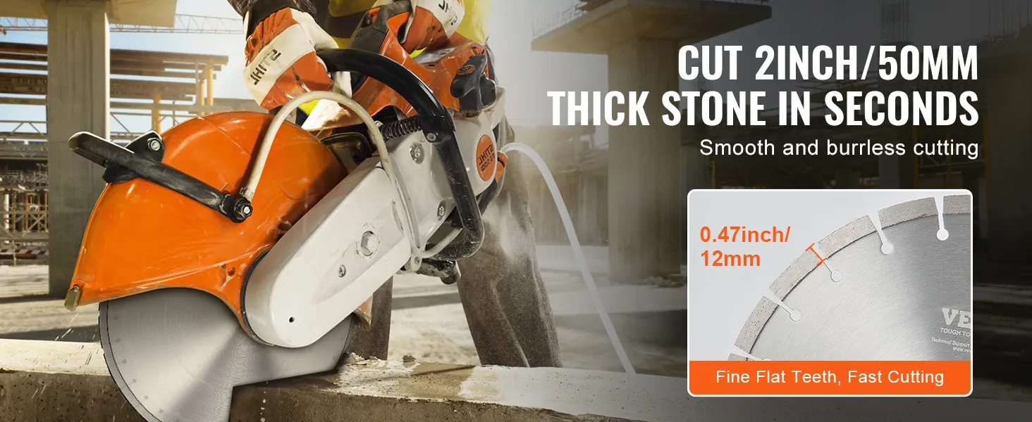 Efficient and Stable Performance: The flat-tooth design provides high cost-efficiency, speed, and cutting precision. The concrete saw blade achieves high-precision cuts with clean, burr-free edges. The 0.47-inch widened segments further enhance durability, ensuring fast and stable cutting over extended periods without the need for blade changes.