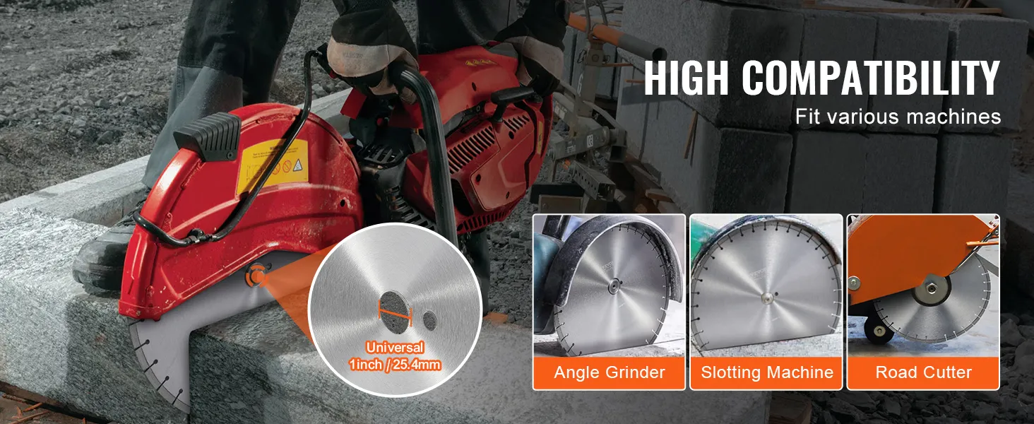 Our concrete diamond blade features a universal 1-inch/25.4mm center hole, compatible with most equipment on the market. Whether for road grooving on construction sites or tile cutting for daily repairs, it adapts easily.