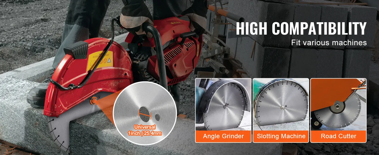 Our concrete diamond blade features a universal 1-inch/25.4mm center hole, compatible with most equipment on the market. Whether for road grooving on construction sites or tile cutting for daily repairs, it adapts easily.