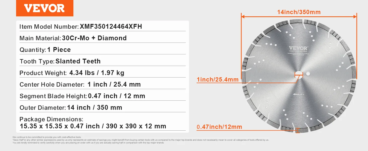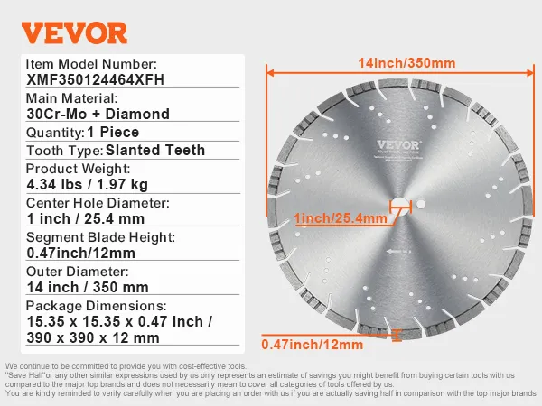 VEVOR Diamantzaagblad, 14 inch/350 mm betonzaagblad voor nat of droog werk, 0,47 inch/12 mm diamantsegmentzaagblad met schuine tanden, universele middengatdiameter 1 inch/25,4 mm, voor beton, cementplaten, tegels, bakstenen