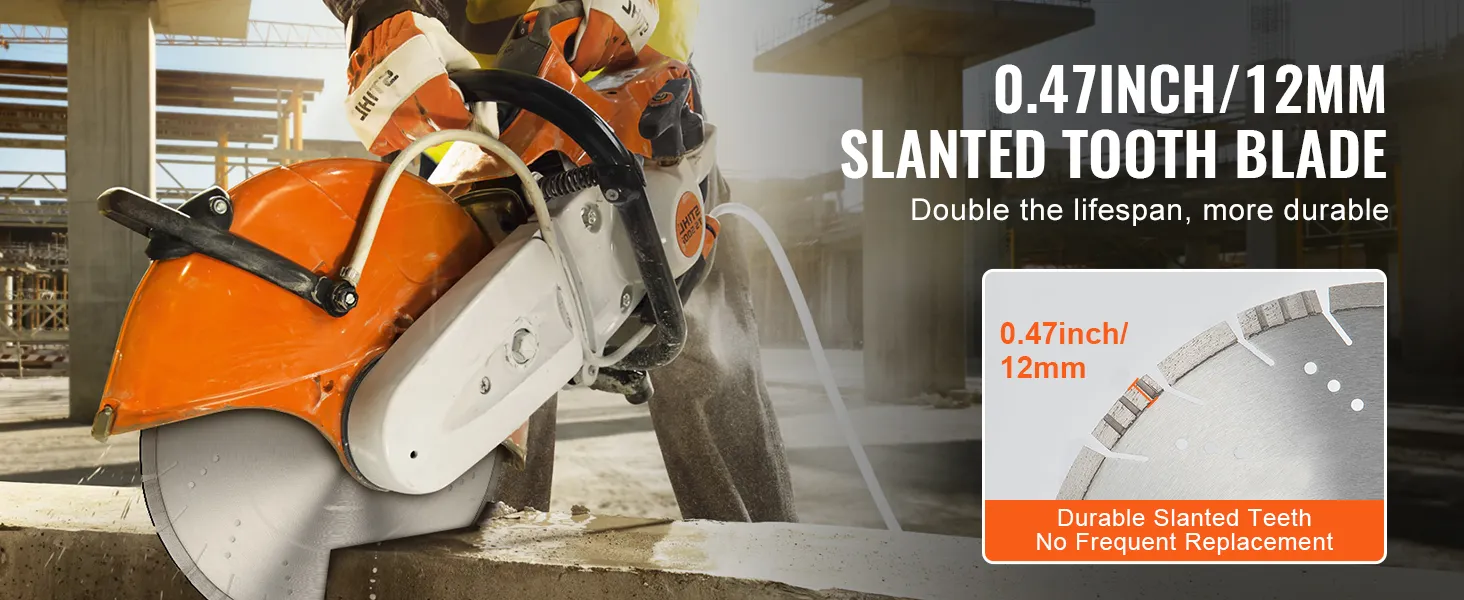 Het schuine tandontwerp verlengt de levensduur in vergelijking met traditionele platte tanden. In combinatie met een segmenthoogte van 12 mm verhoogt dit de levensduur en de zaagsnelheid en maakt langdurig gebruik mogelijk zonder frequente zaagbladwissels.