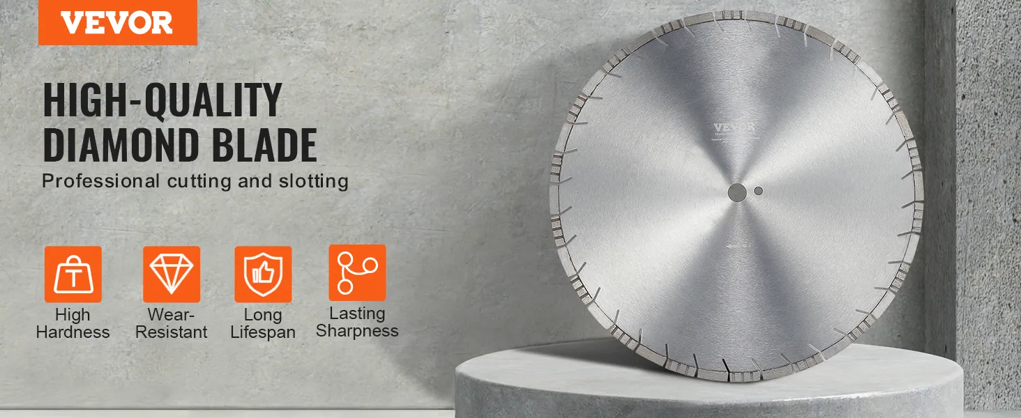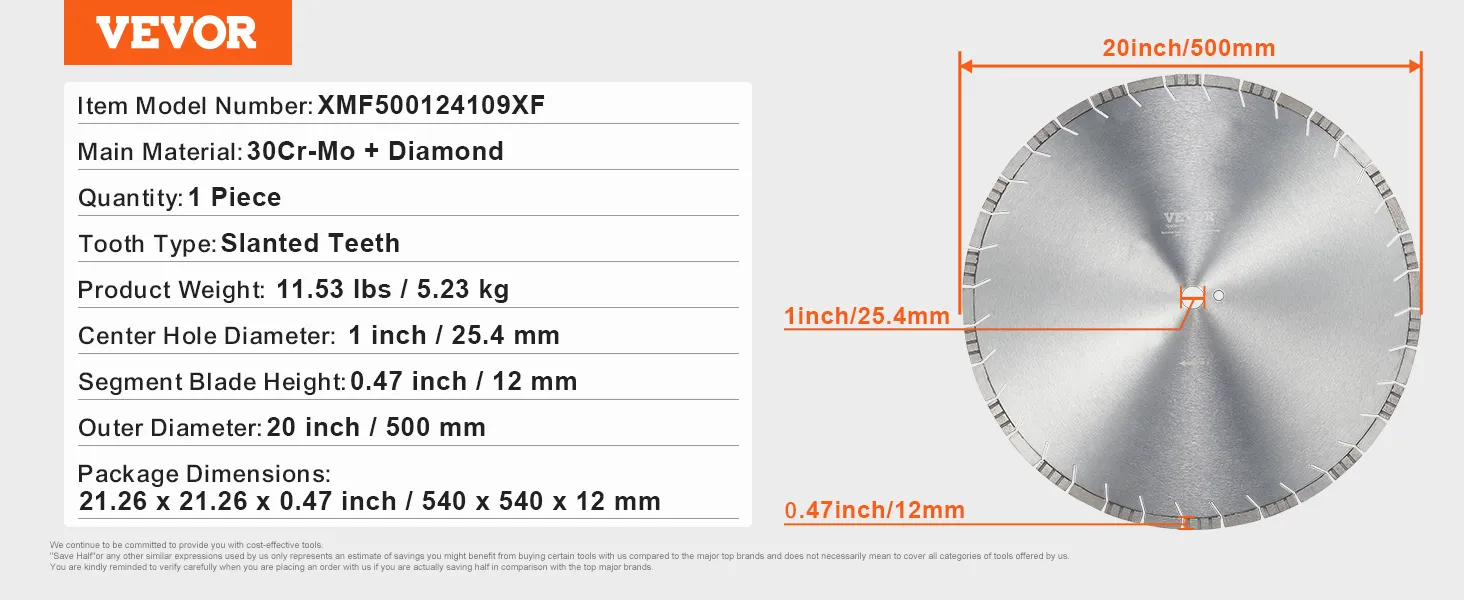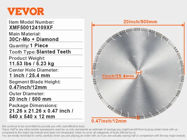 VEVOR Diamond Blade, 20inch/500mm Concrete Saw Blade Wet or Dry, 0.47inch/12mm Slanted Teeth Diamond Segment Blade, Universal 1 inch/25.4 mm Center Hole Diameter, for Concrete Cement Board Tile Brick VEVOR Diamond Blade, 20inch/500mm Concrete Saw Blade Wet or Dry, 0.47inch/12mm Slanted Teeth Diamond Segment Blade, Universal 1 inch/25.4 mm Center Hole Diameter, for Concrete Cement Board Tile Brick
