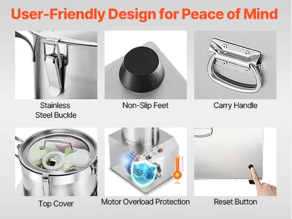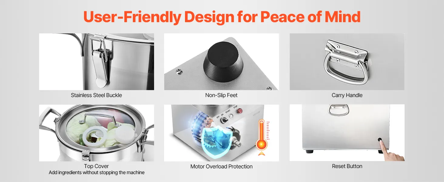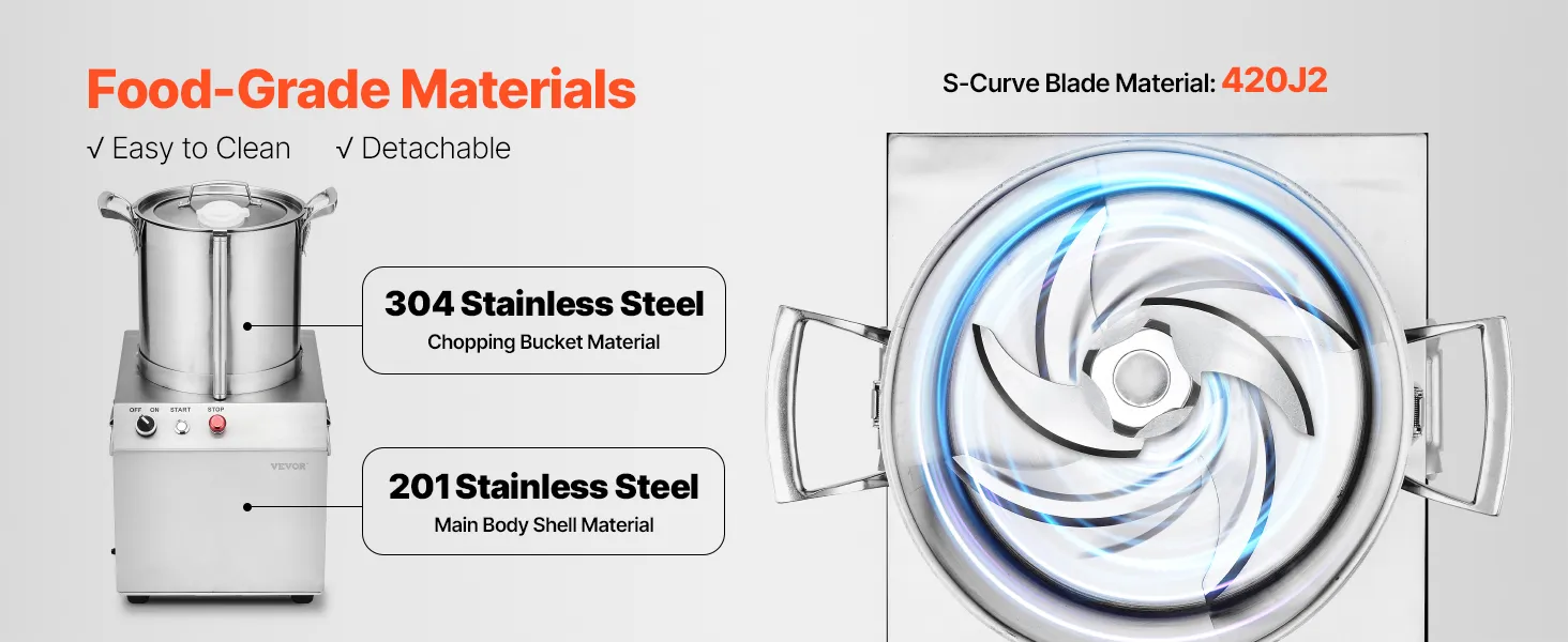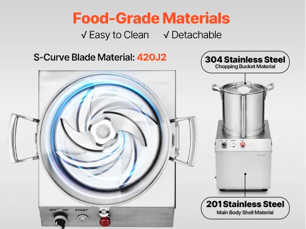 Voedselveilig materiaal: Alle onderdelen die in contact komen met voedsel zijn gemaakt van voedselveilig roestvrij staal. De messen en accessoires zijn afneembaar en vaatwasmachinebestendig, waardoor schoonmaken probleemloos verloopt.