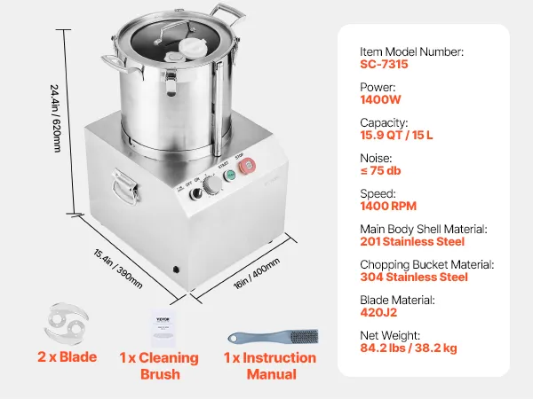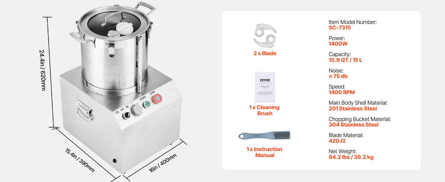 Large Capacity: With a 15L (15.9 qt) chopping bucket, this electric food processor is ideal for both large and small batch processing, meeting a variety of preparation needs.