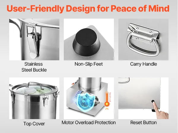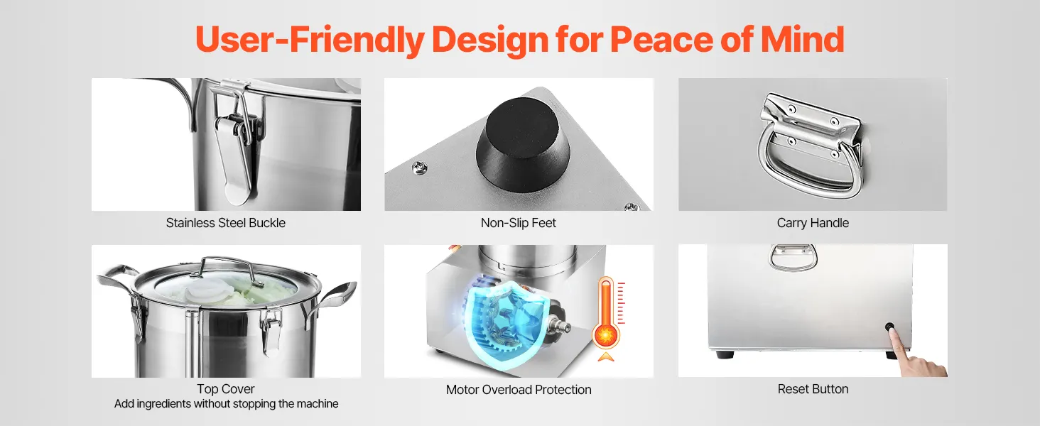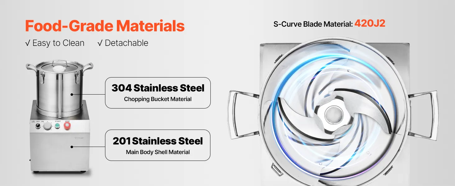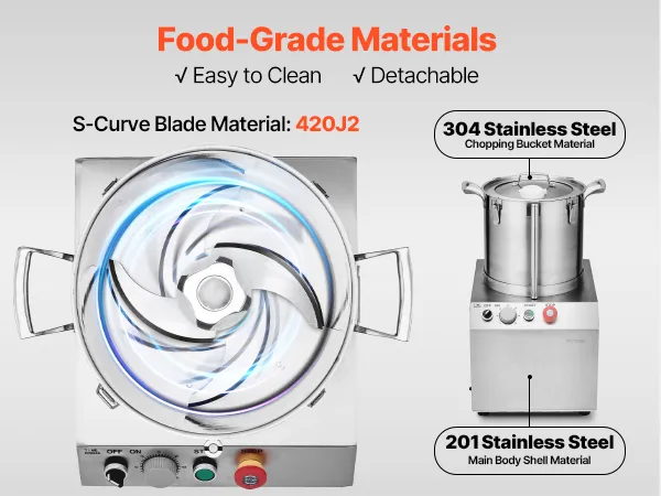 Food-Grade Material: All parts in contact with food are made from food-grade stainless steel. The blades and accessories are detachable and dishwasher safe, making cleanup hassle-free.