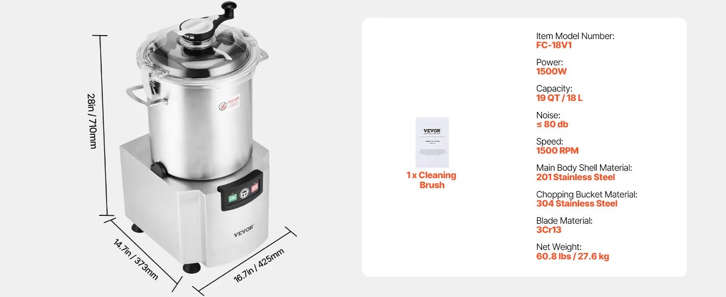 Grote capaciteit: Met een hakcontainer van 18 liter (19QT) is deze elektrische keukenmachine ideaal voor het verwerken van grote en kleine hoeveelheden en voldoet aan verschillende kookbehoeften.
