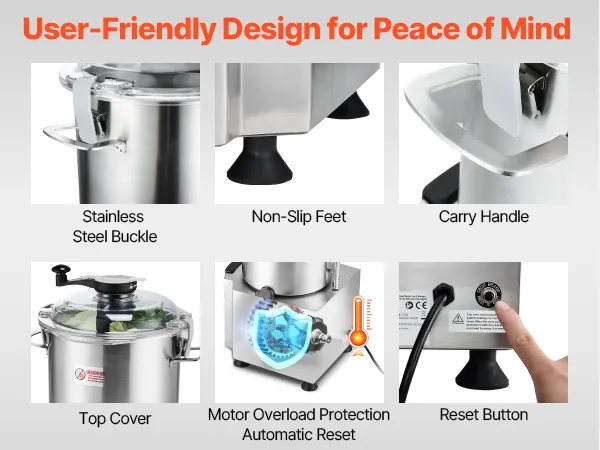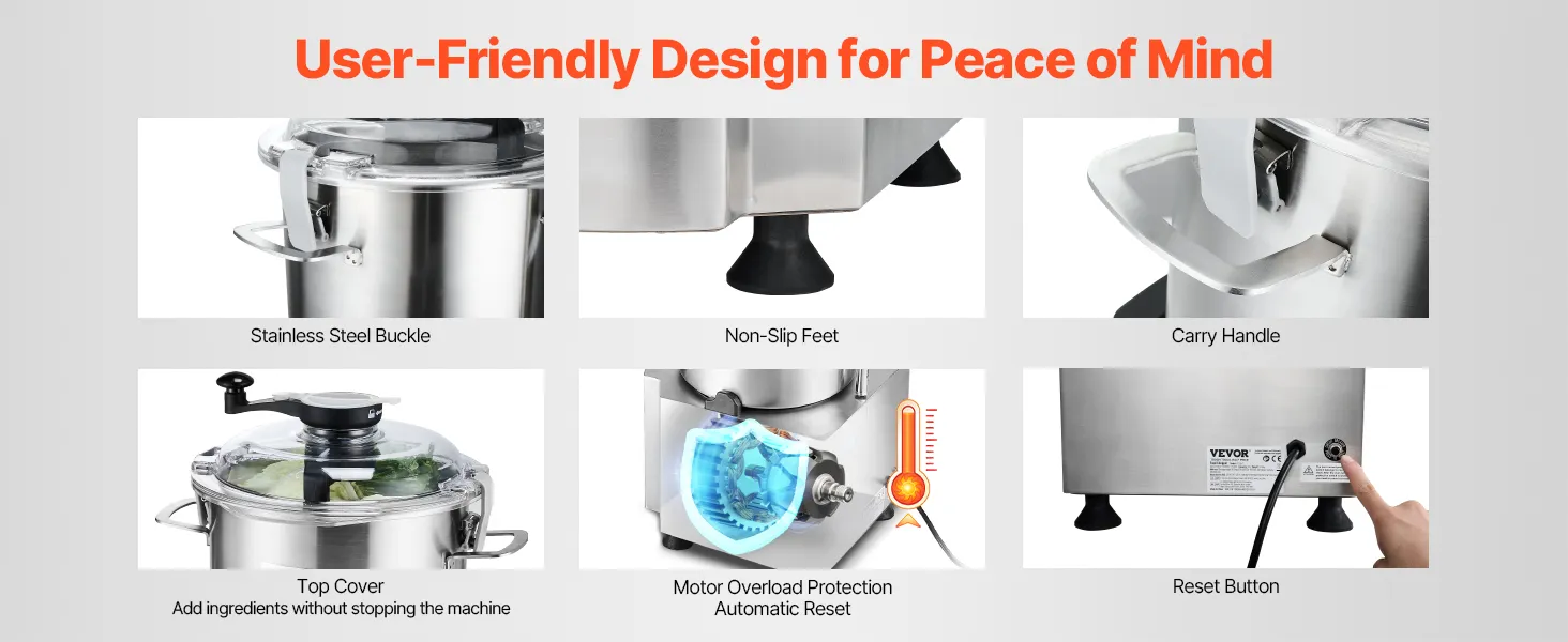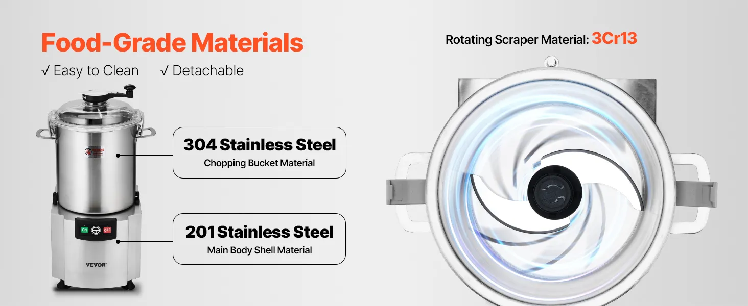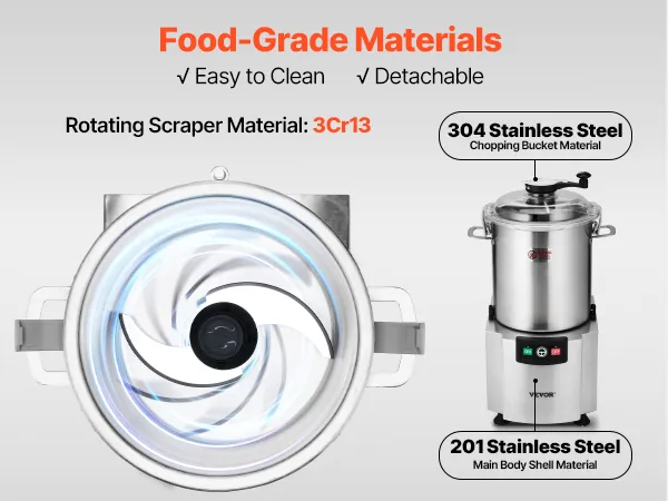 Voedselveilig materiaal: Alle onderdelen die in contact komen met voedsel zijn gemaakt van voedselveilig roestvrij staal. De messen en accessoires zijn afneembaar en vaatwasmachinebestendig, waardoor schoonmaken probleemloos verloopt.