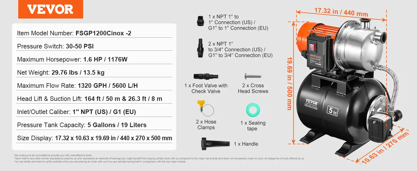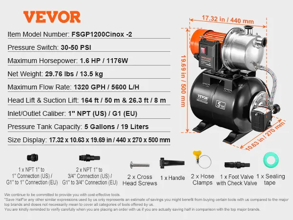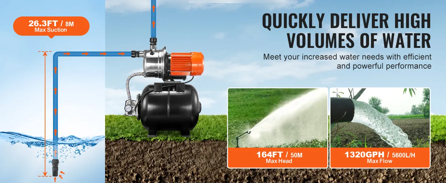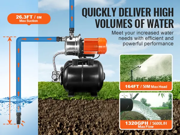 Uiterst efficiënte watertoevoer: Uitgerust met een motor van 1,6 pk (1176 W), levert onze ondiepe bronpomp met druktank een maximaal debiet van 1320 GPH (5600 l/u), een opvoerhoogte tot 50 meter (164 voet) en een zuigdiepte van 26,3 voet (8 m). Ideaal voor het verpompen van water over lange afstanden met indrukwekkende efficiëntie.